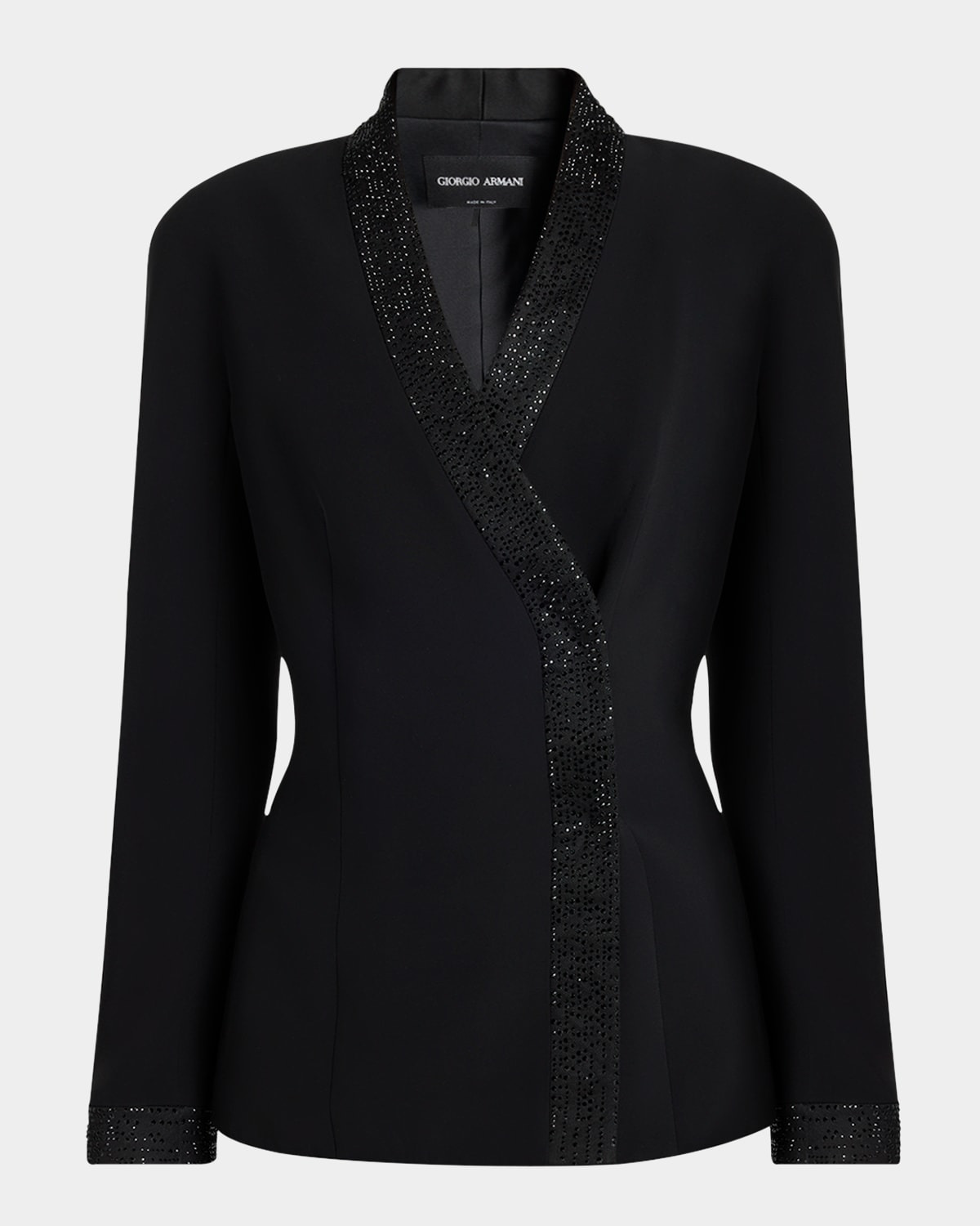 Giorgio Armani asymmetric jacket featuring strass embellished lapels Collarless; doublebreasted front Long sleeves Slim fit Button closure Silk Dry clean Made in Italy