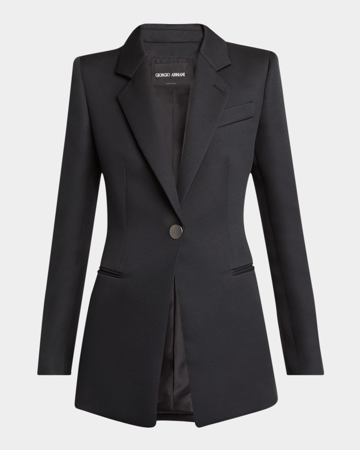 - Giorgio Armani blazer from high-performance techno scuba fabric - Notch lapels - One-button closure - Long Sleeves; button cuffs - Chest pocket; waist pockets - Polyester - Dry clean - Made in Italy