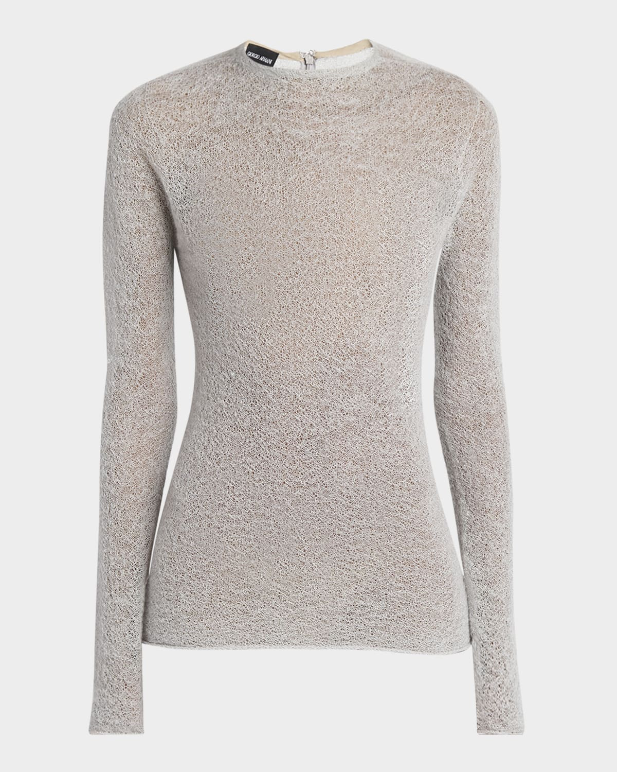- Giorgio Armani top in textured cashmere blend knit - Crew neckline - Long sleeves - Fitted - Back zip - Cashmere/mohair - Dry clean - Made in Italy