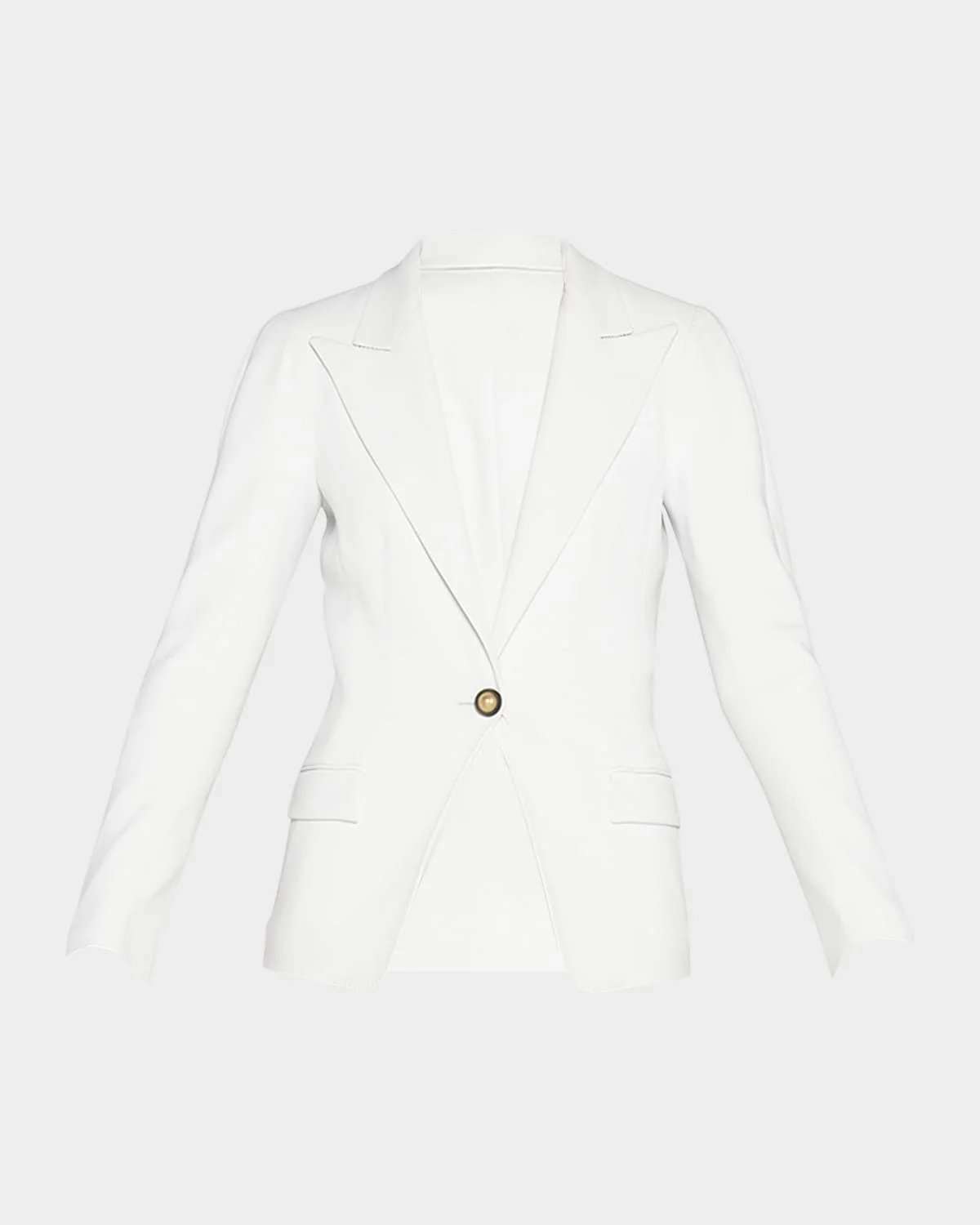 Giorgio Armani cady blazer featuring a novelty button Peak lapels; singlebreasted front Long sleeves Chest welt pocket; side flap pockets Slim tailored fit Viscose/elastane Dry clean Made in Italy