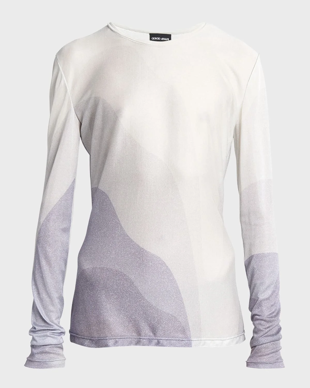 Wave-Print Long-Sleeve Metallic Silk Jersey Knit Top