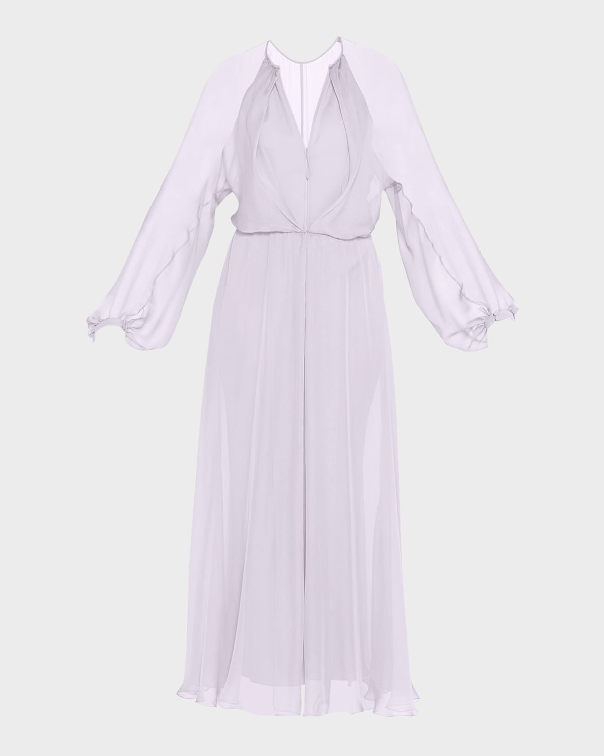 Giorgio Armani silk chiffon layered gown featuring a halfzip front styling Split V neckline Long blouson sleeves Aline silhouette Full length Silk Dry clean Made in Italy