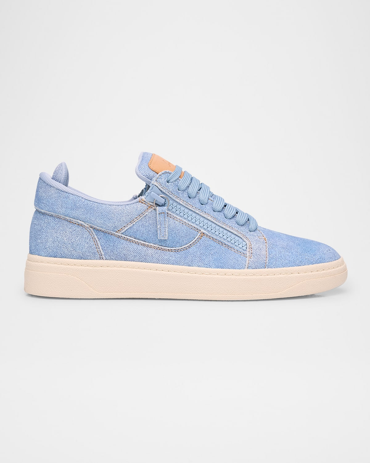 - Giuseppe Zanotti "GZ 94" low-top sneakers in denim fabric - Flat heel - Round toe - Lace-up vamp - Leather logo patch on tongue - Padded collar - Leather lining - Side zips for easy on and off - Heel logo - Rubber outsole - Made in Italy