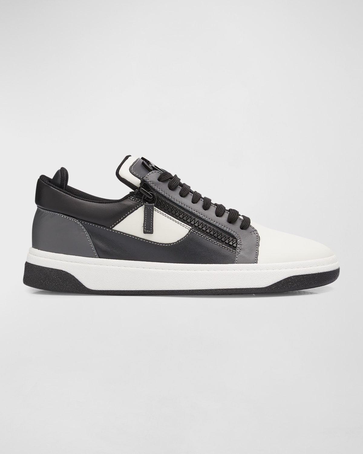 - Giuseppe Zanotti low-top sneakers with contrast calf leather upper - Flat heel - Round toe - Lace-up vamp - Side zip closures for easy on and off - Logo hardware at tongue - Padded collar - Embossed logo at heel - Rubber outsole - Dry clean - Made in Italy