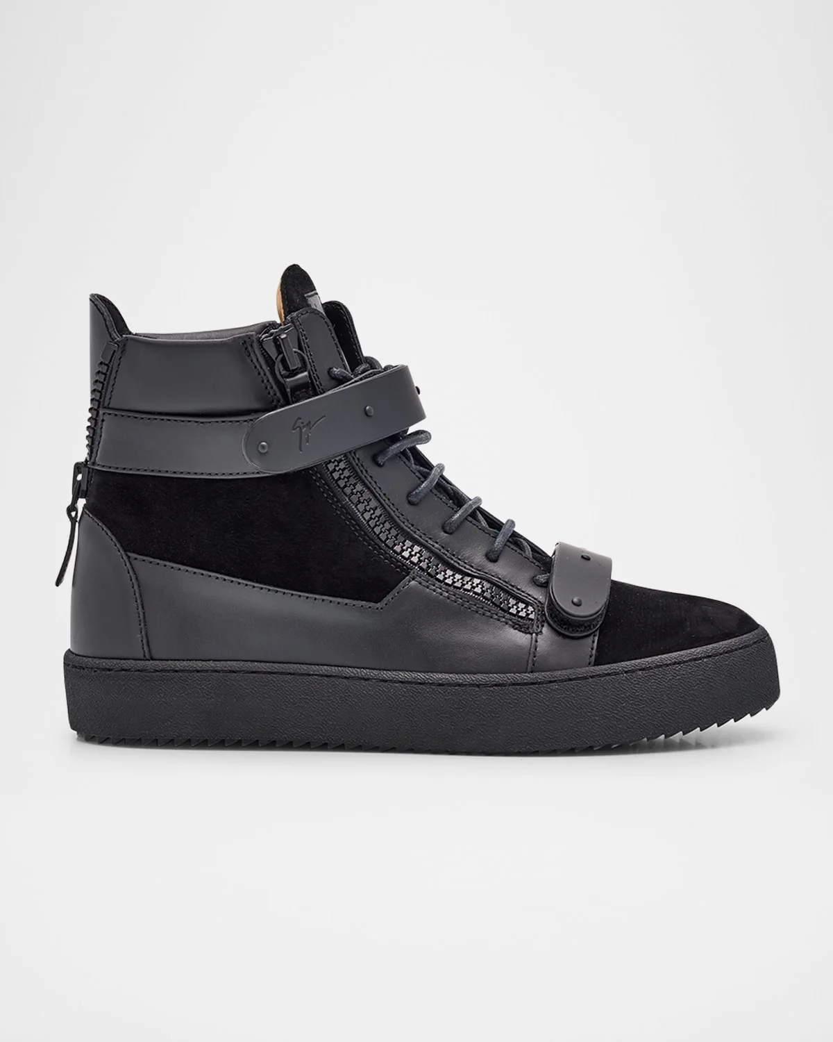The "Ru50040" hightop sneakers from Giuseppe Zanotti are crafted in suede and smooth leather, highlighted with double gripstraps and side zips. Flat heel Round cap toe with grip strap Laceup vamp Leather tongue label Leather lining Back zip eases dress Heel logo Rubber outsole Made in Italy