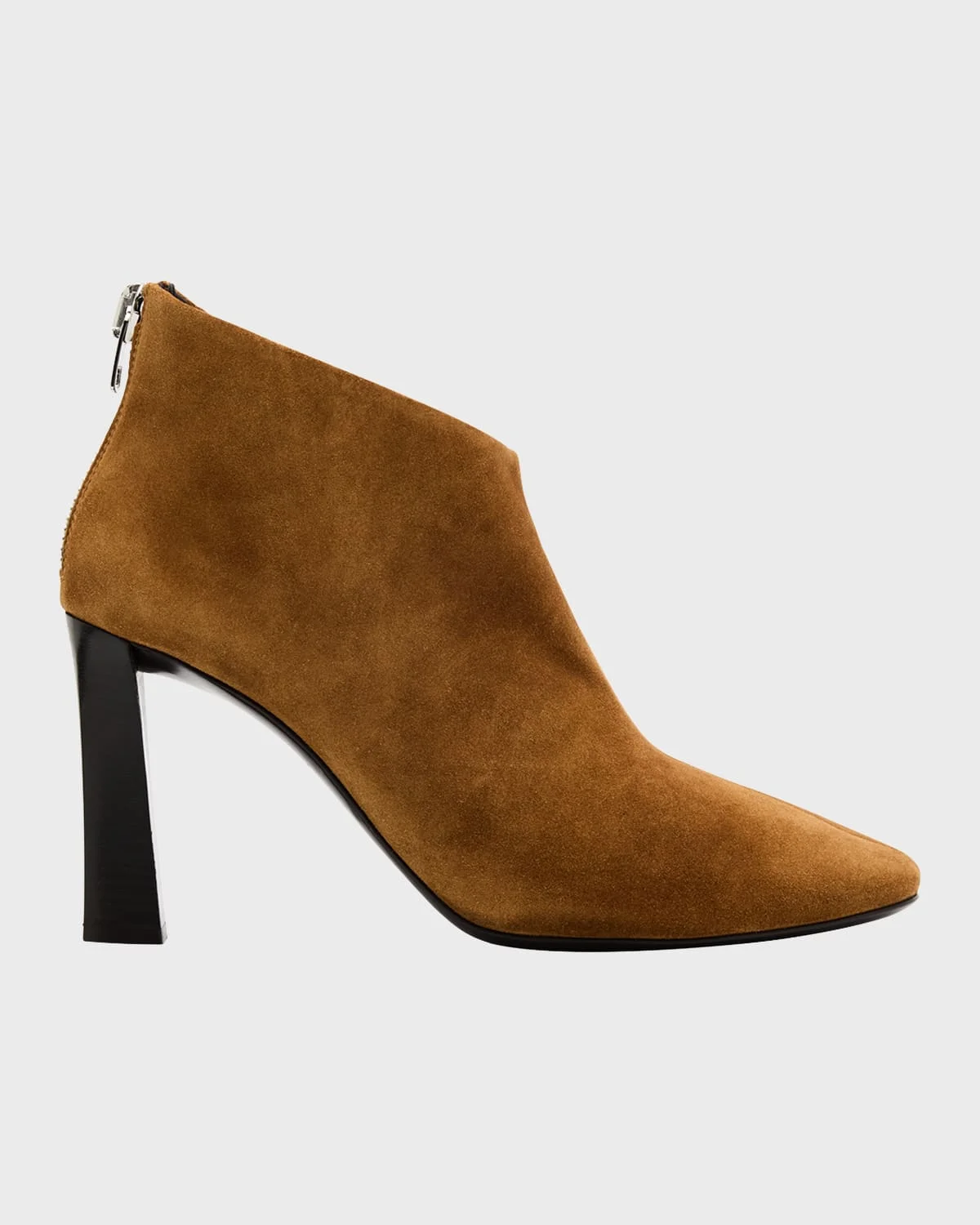 These lowcut ankle booties from Giuseppe Zanotti are expertly crafted in soft suede leather. 3.50 in / 90 mm block heel Round toe Exposed back zipper Leather outsole Lining: Leather Made in Italy
