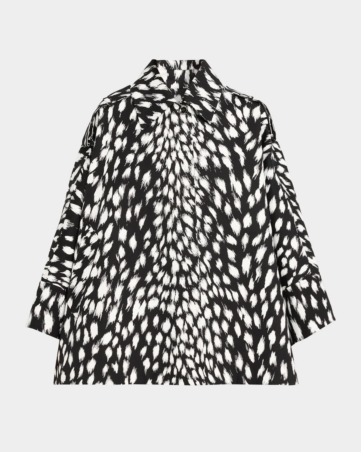 This abbreviated trench coat by Givenchy features a wide, cocoon shape and a bold animal print Point collar; concealed button front Shoulder epaulets Relaxed long sleeves Side seam pockets Back storm flap Oversized fit Midlength Cotton Made in Italy