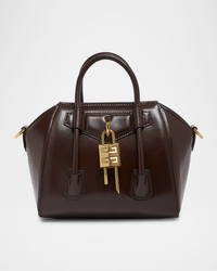 - Givenchy "Antigona" satchel bag in calf leather. - Rolled top handles. - Detachable, adjustable shoulder strap. - Envelope flap detail with hanging padlock logo charm. - Feet protects bottom of bag. - Approx. 7.9"H x 8.7"W x 5.1"D - Made in Italy.
