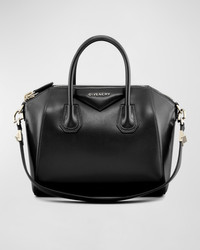 - Givenchy shiny calfskin satchel bag with shiny palladium hardware. - Rolled tote handles, 3.5" drop. - Flat shoulder strap, 13.4" drop. - Extended zip top closure. - Envelope flap detail with metal logo lettering. - Interior, cotton lining; one zip pocket and two open pockets. - Feet protect bottom of bag. - 9"H x 10.5"W x 6.5"D. - "Antigona" is made in Italy.