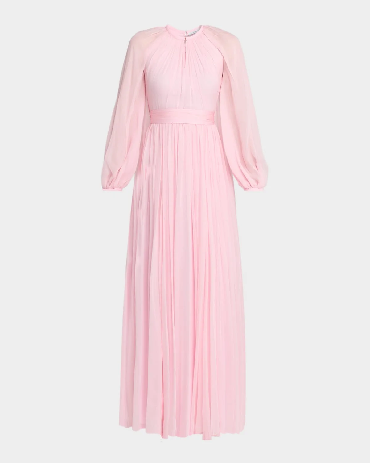 Givenchy gown is crafted of crinkled silk chiffon featuring a gathered neckline, waist sash, and balloon sleeves Round neckline; hook/keyhole front Long balloon sleeves; button cuffs Fitandflare silhouette Floor length Invisible back zip Silk Lining: Acetate/silk Made in Italy