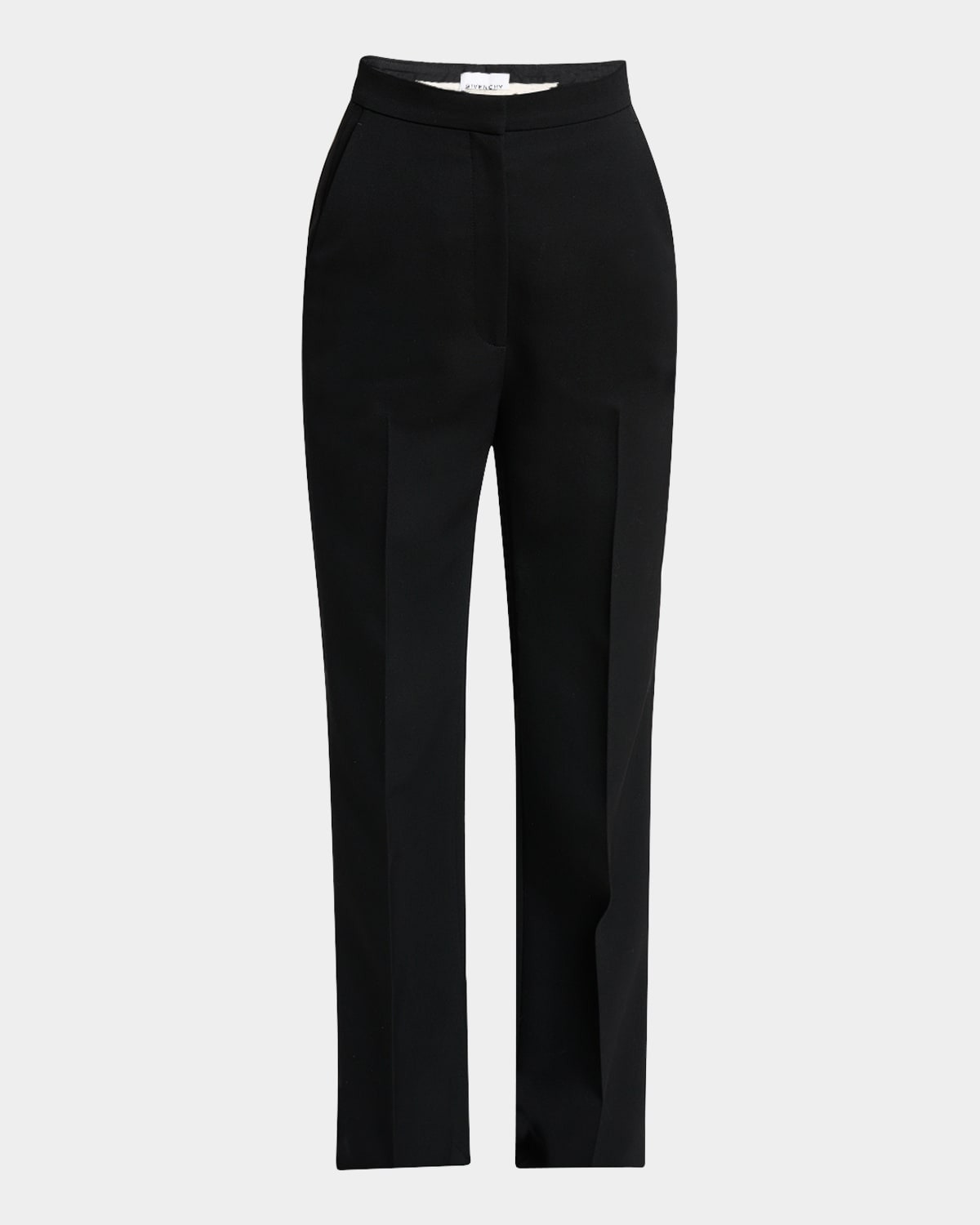 - Givenchy tuxedo pants featuring a satin side stripe - High waist - Side slip pockets - Back welt pockets - Straight fit - Full length - Hook/zip fly - Wool/silk/polyester - Made in Italy