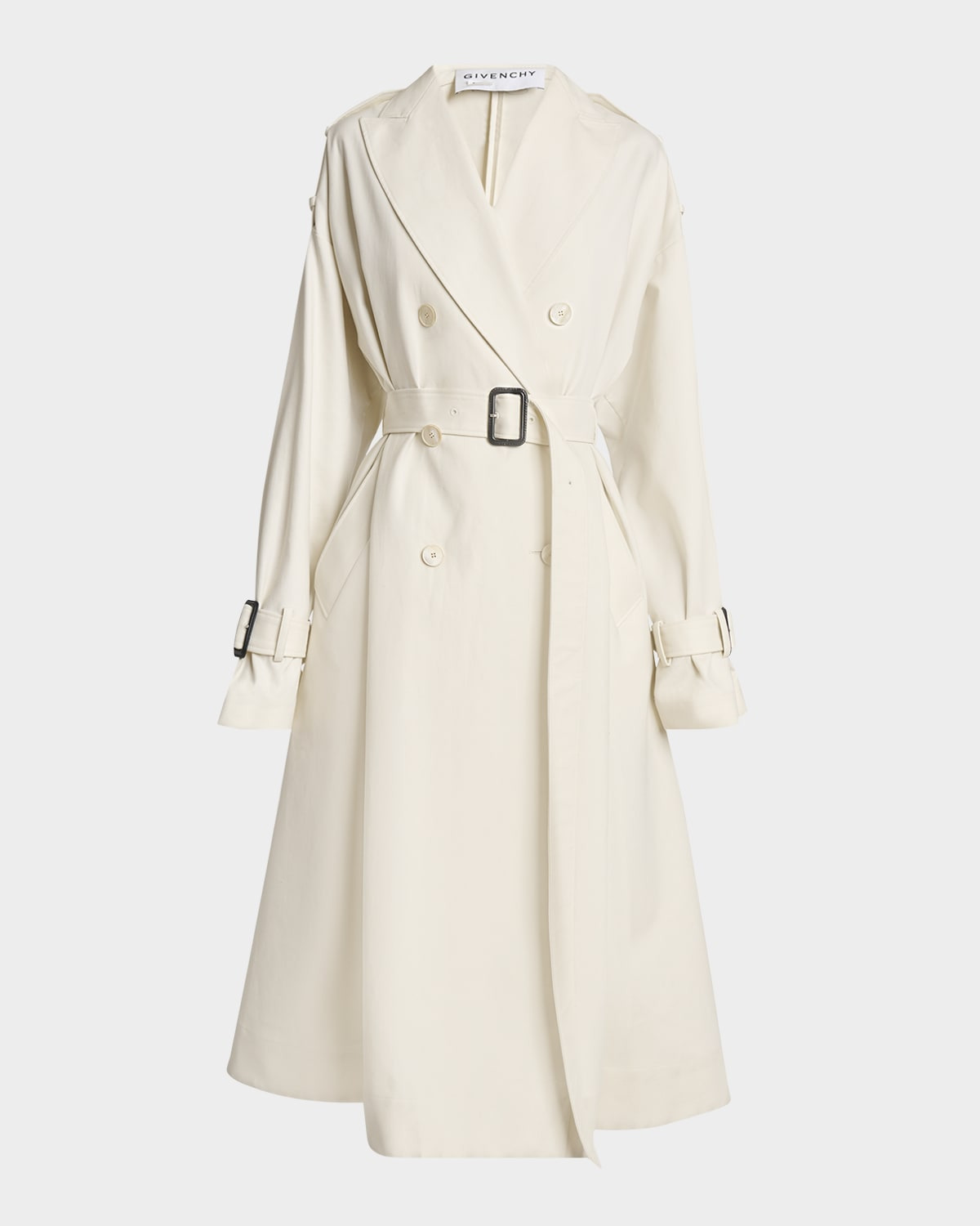 - Givenchy trench coat with cocoon shoulder and a self belt with leather trim - Peak lapels; double-breasted front - Long sleeves; belted cuffs - Shoulder paulets - Rain shield back - Hip welt pockets - Belted waist - A-line silhouette - Hem falls below the knee - Center-back vented hem - Cotton - Made in Italy