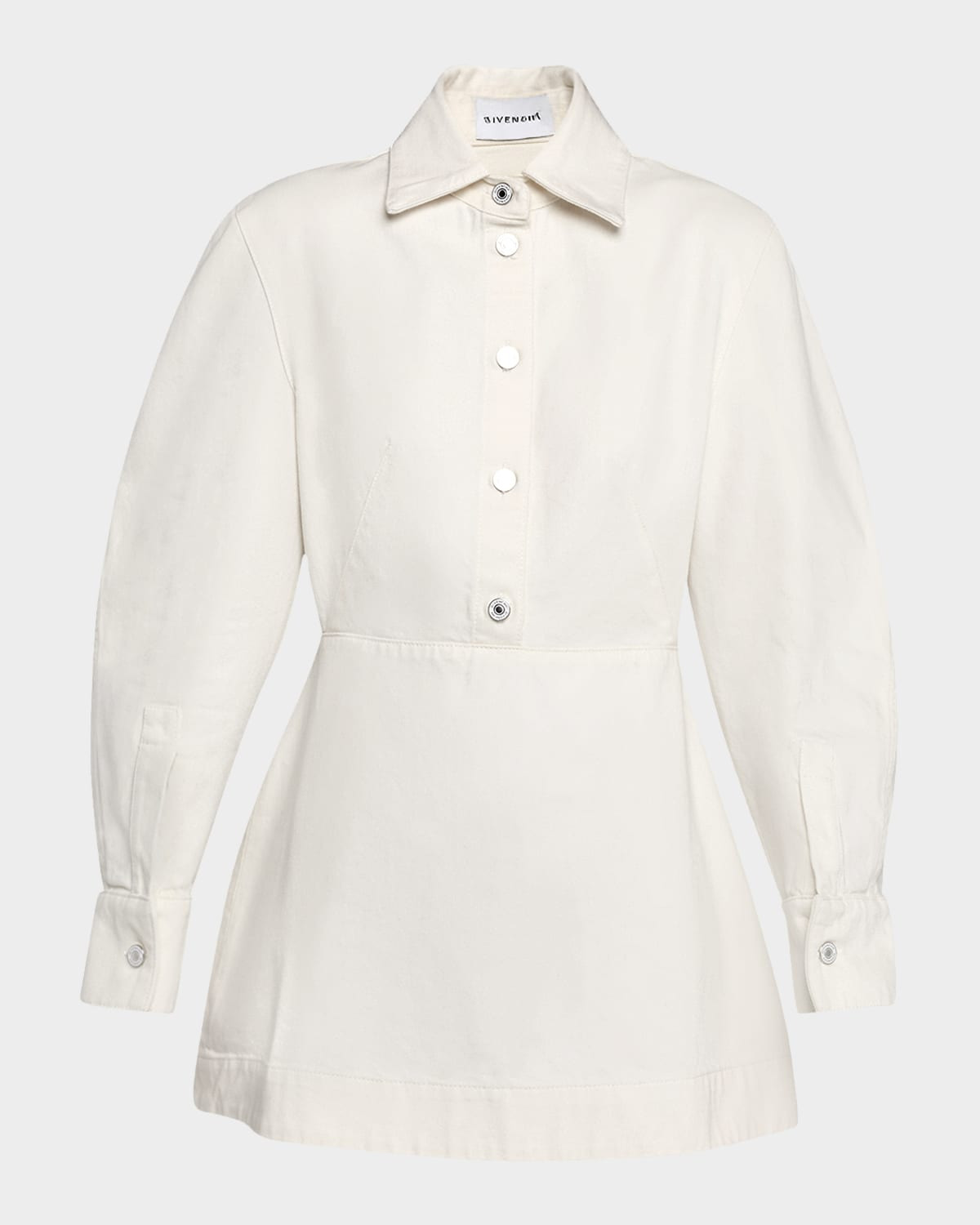 - Finished with silver-tone buttons, this shirtdress by Givenchy is crafted from white-wash non-stretch denim - Shirt collar; partial button front - Long cocoon sleeves; button cuffs - Yoked back - Hem falls above the knee - A-line silhouette - Slipover style - Cotton - Made in Italy