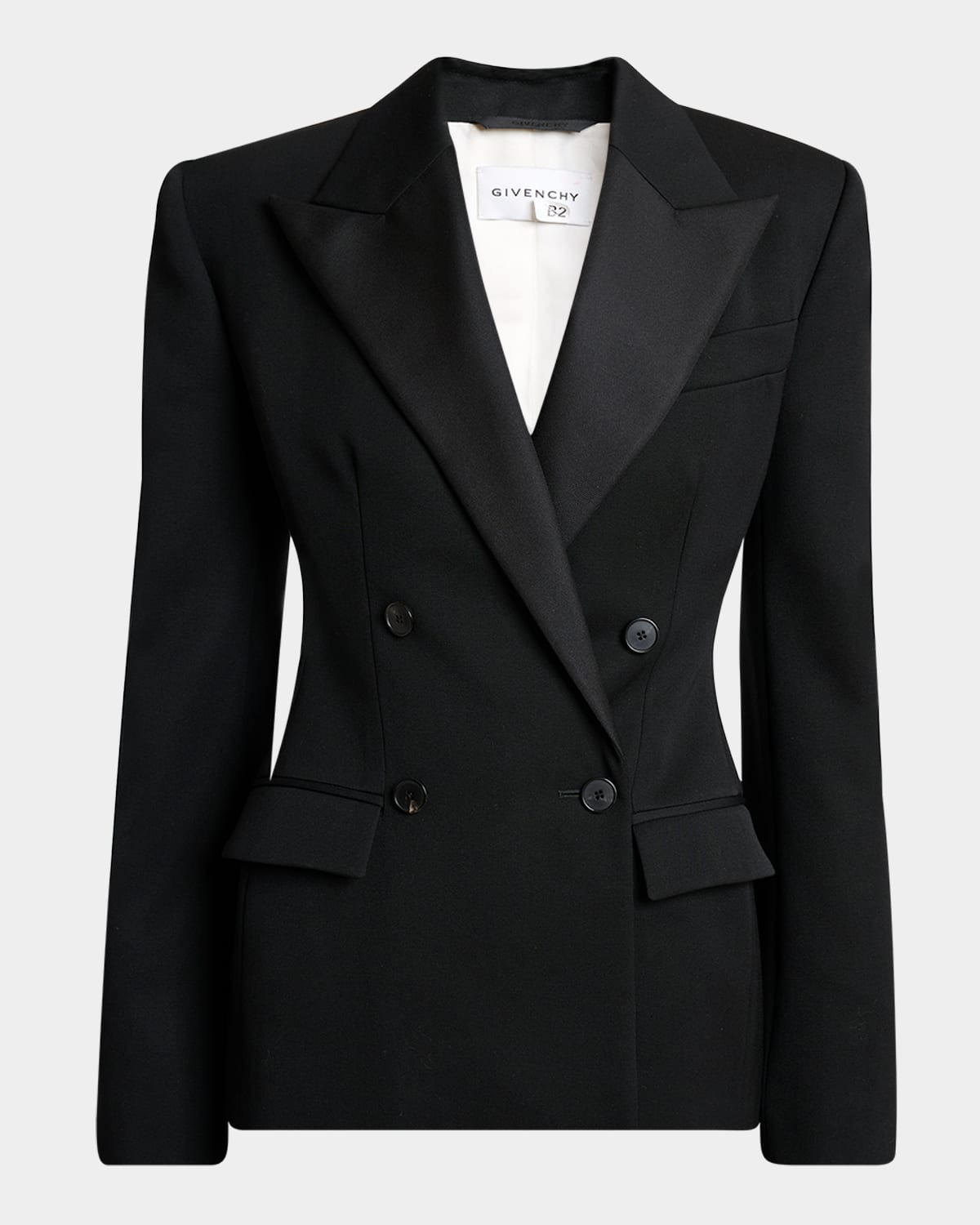 - Givenchy tuxedo jacket fetauring satin lapels and trim - Peak lapels; double-breasted front - Long sleeves; button cuffs - Chest welt pocket - Hip flap pockets - Slim tailored fit - Hem falls below the hip - Center-back vented hem - Wool/silk/polyester - Lining: Polyester - Made in Italy