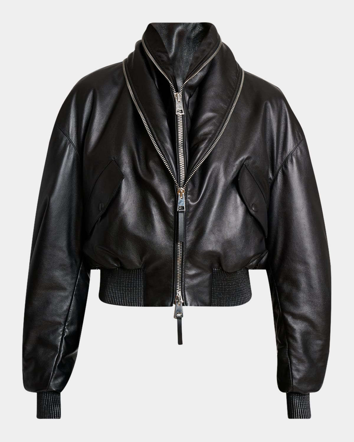 - Givenchy lambskin leather bomber jacket featuring a double collar detail with infinity zippers - Shawl collar; two-way zip front - Long sleeves - Chest snap-flap pockets - Relaxed fit - Corped length - Ribbed cuffs and hem - Leather - Lining: Viscose - Made in Italy