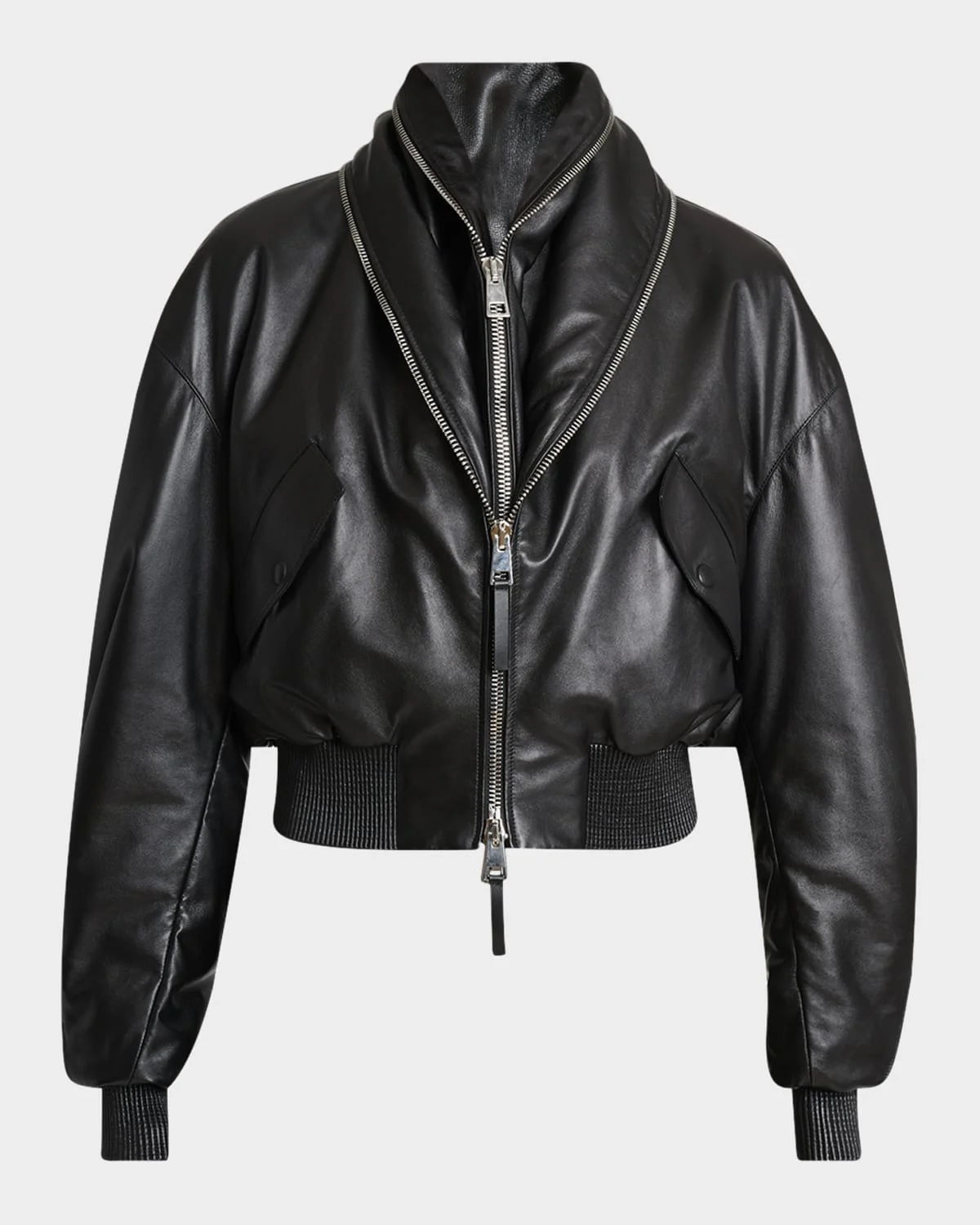 Givenchy lambskin leather bomber jacket featuring a double collar detail with infinity zippers Shawl collar; two-way zip front Long sleeves Chest snap-flap pockets Relaxed fit Cropped length Ribbed cuffs and hem Leather Lining: Viscose Made in Italy