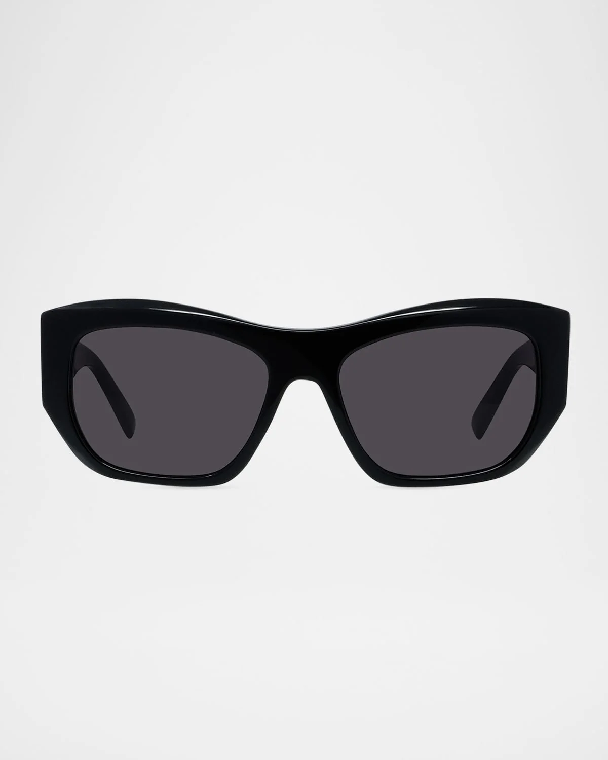 Givenchy rectangular sunglasses crafted of bioacetate From the GV Day line Eye/bridge/temple (in mm): 5417135 Monochromatic lenses Saddle nose bridge Wide, tapered arms Logo signature engraved on the temples 100% UVA/UVB protection Acetate Hand wash Imported