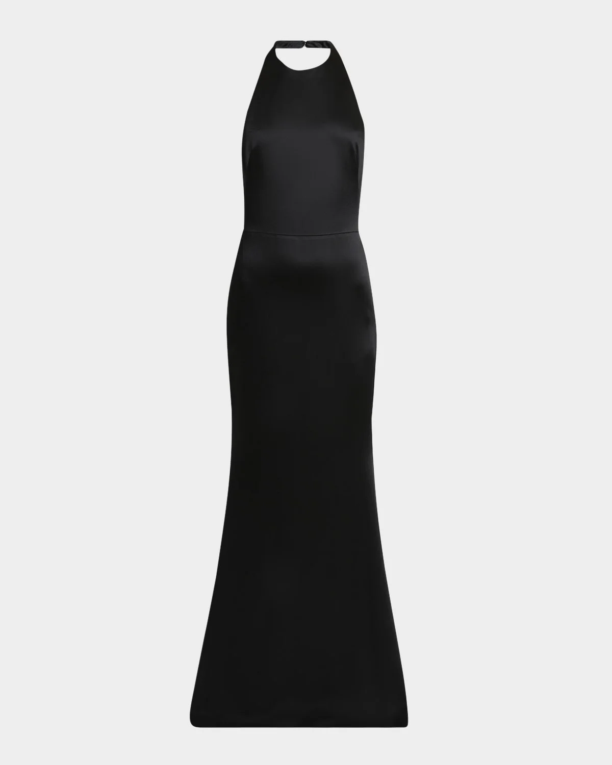 - Givenchy satin gown featuring an open back - Halter neckline; button back - Sleeveless - Trumpet silhouette - Floor sweeping hem - Invisible back zip - Viscose/acetate - Lining: Acetate/viscose - Made in Italy