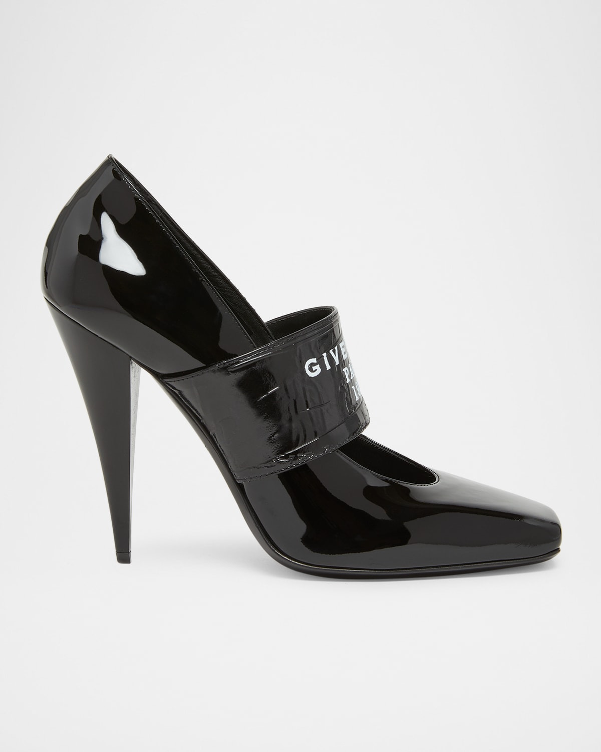 - Adorned with a contrasting label strap at mid-vamp, these Givenchy pumps are made of patent calf leather - 3.75 in / 95 mm stiletto heel - Squared pointed toe - Slip-on style - Leather lining - Made in Italy