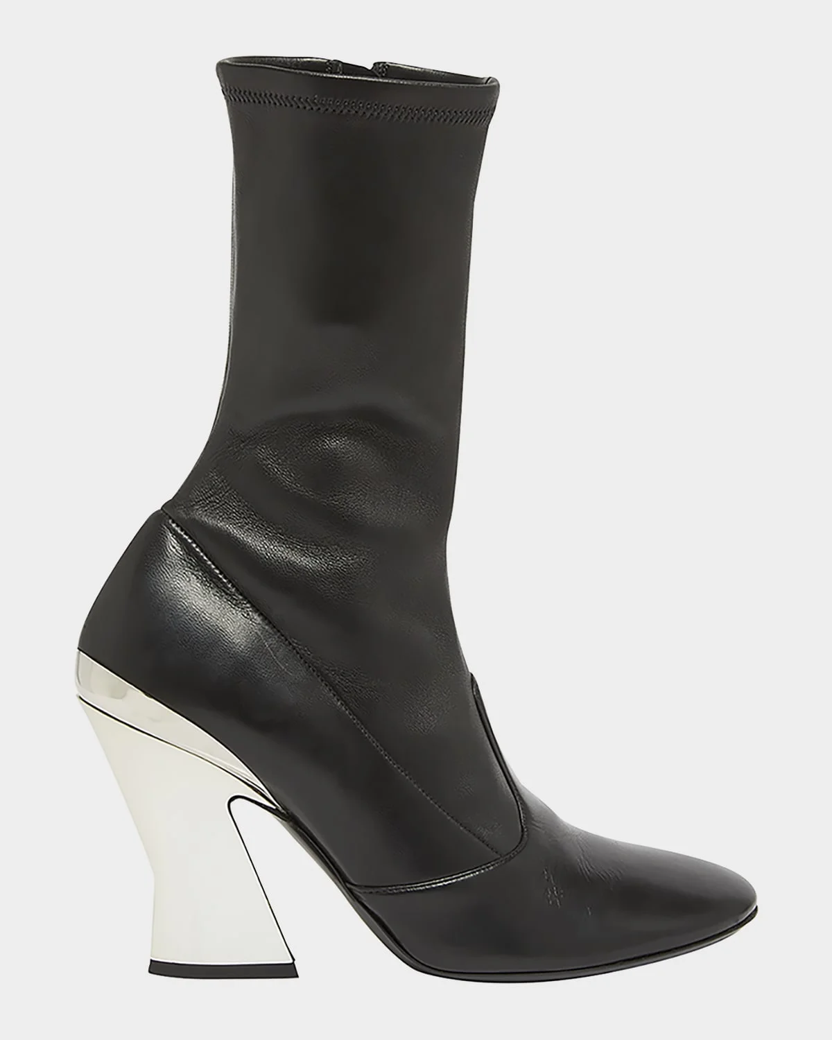 Givenchy ankle booties in lambskin leather 3.75 in / 95 mm sculpted metallic block heel Round toe Side zip for easy on/off Lining: Unlined Made in Italy