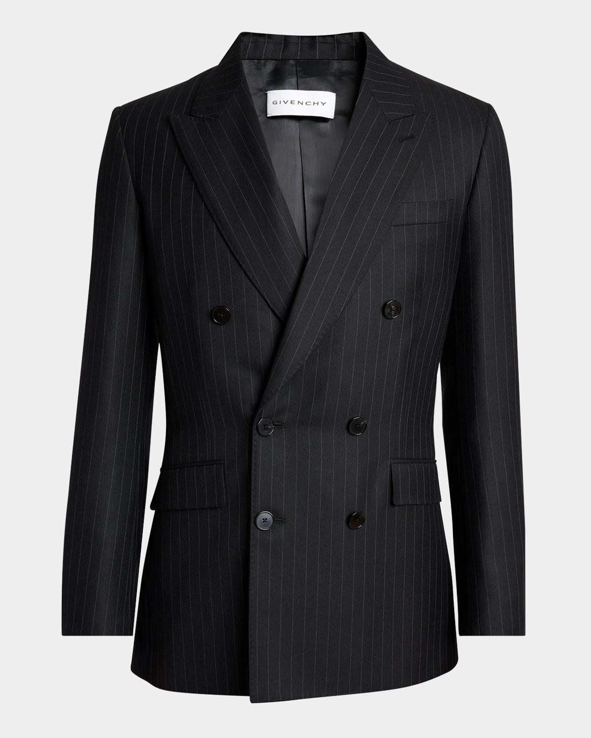 - Givenchy sport coat in pinstripes - Peak lapels - Double-breasted button closure - Chest welt pocket - Hip flap pockets - Interior jet pocket - Four-button sleeve finish - Double vent - Wool - Lining: Cupro/viscose - Made in Italy
