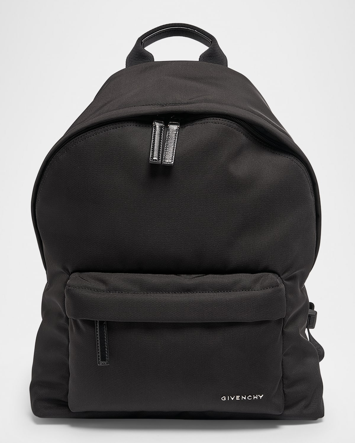 - Givenchy "Essential U" backpack in nylon showcasing subtle silvertone logo hardware on the front - Adjustable shoulder straps - Flat top handle - Two-way zip closure - Exterior, one front zip pocket - Approx. 16.9"H x 12.5"W x 7.8"D - Made in Italy