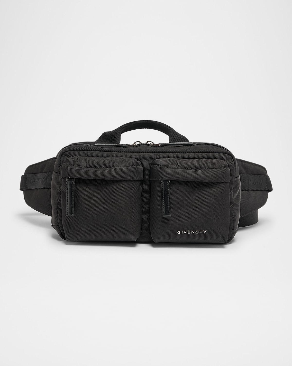 - Givenchy "Essential U" belt bag in nylon showcasing subtle silvertone logo hardware on the front - Adjustable belt strap - Flat top handle - Two-way zip closure - Exterior, two zip pockets - Approx. 5.9"H x 10.6"W x 2.7"D - Made in Italy