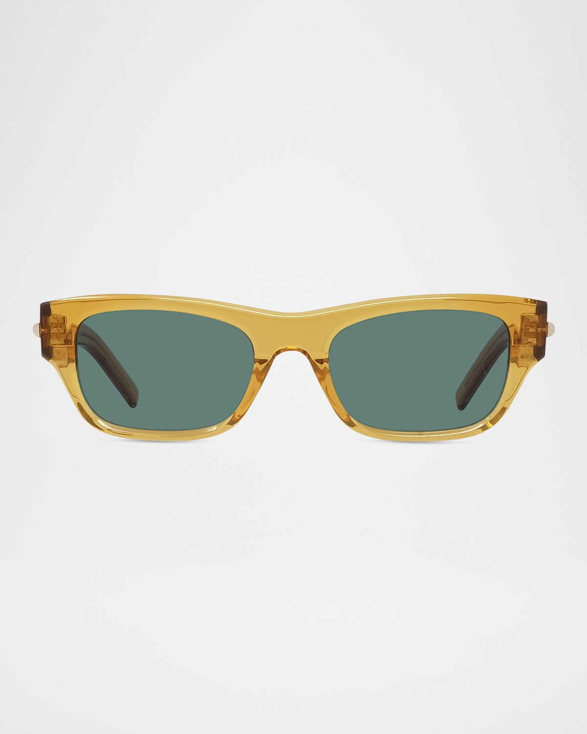 The "GV One" rectangular sunglasses by Givenchy showcase transparent acetate frames with the logo signature on the lock detail of the functional temple hinges Lens/bridge/temple (in mm): 5119145 Solidcolor lenses Saddle nose bridge Guilloche metal accents Exposed metal corewire Acetate Wipe clean 100% UVA/UVB protection Made in Italy