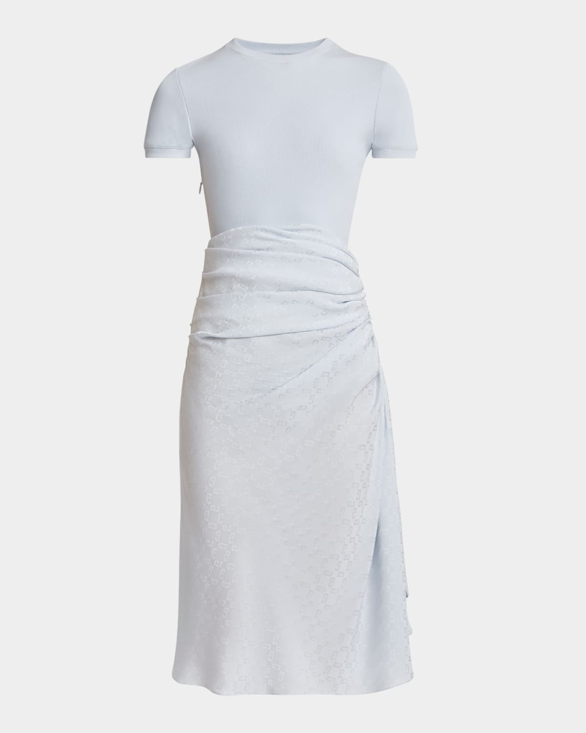 - Givenchy ruched dress featuring a monogram bodice and draped skirt - Round neckline - Short sleeves - Midi length - A-line silhouette - Silk - Made in Italy