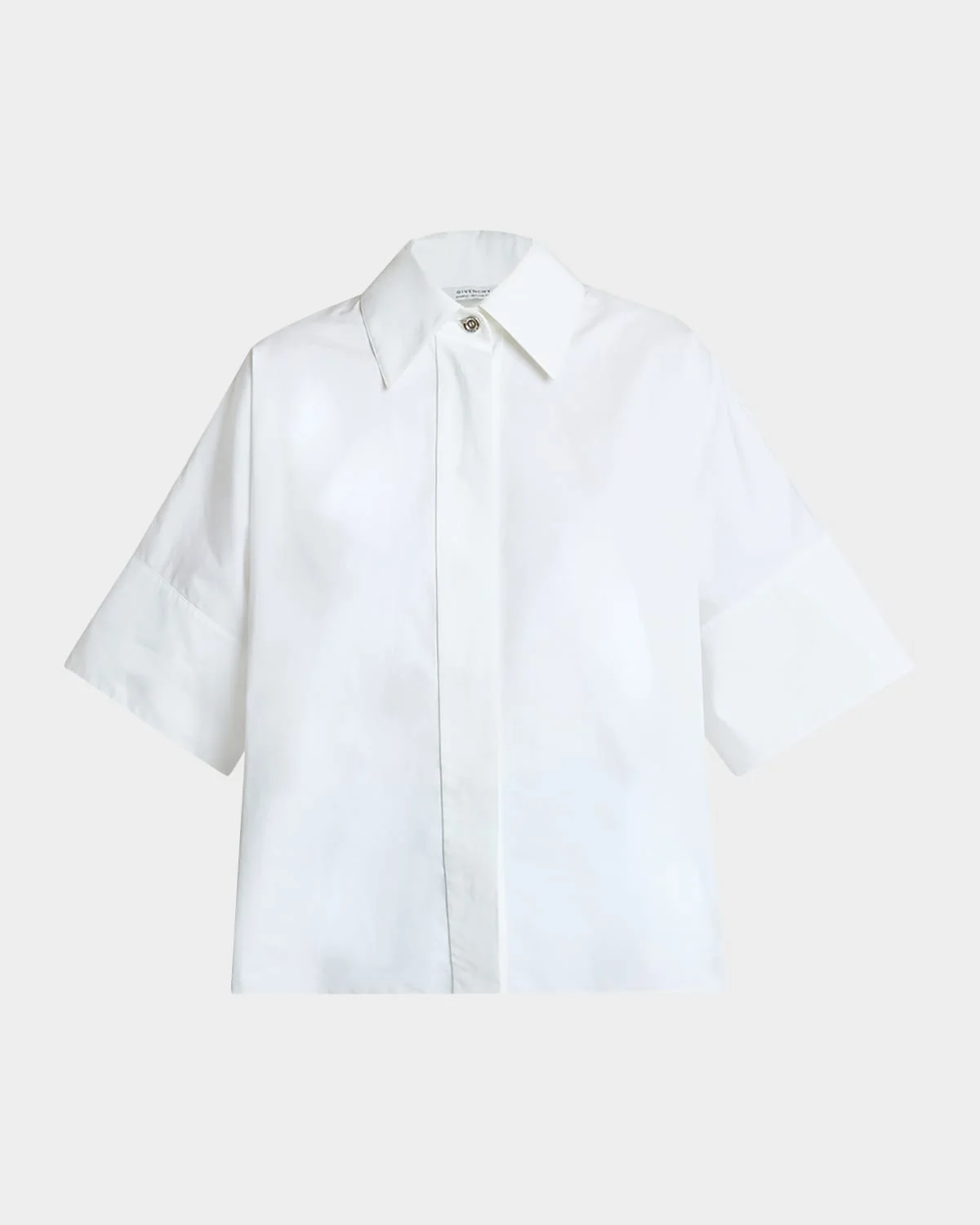 Givenchy shirt is crafted from crisp cotton poplin accented with a back rain shield panel Point collar; concealed button front Elbow sleeves Oversized fit Hip length Cotton Made in Italy