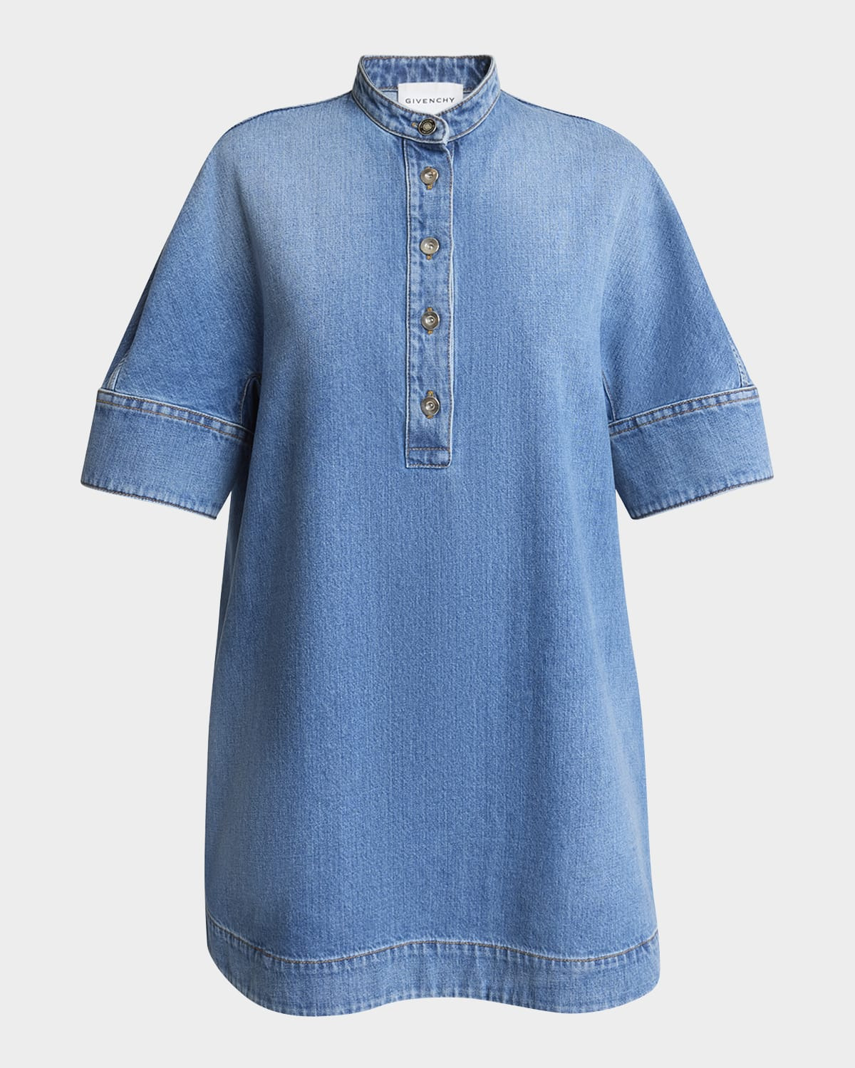 - Givenchy dress in faded medium wash denim - Band collar; five-button front - Short sleeves; button cuffs - A-line shift silhouette - Mini length - Slipover style - Cotton - Made in Romania