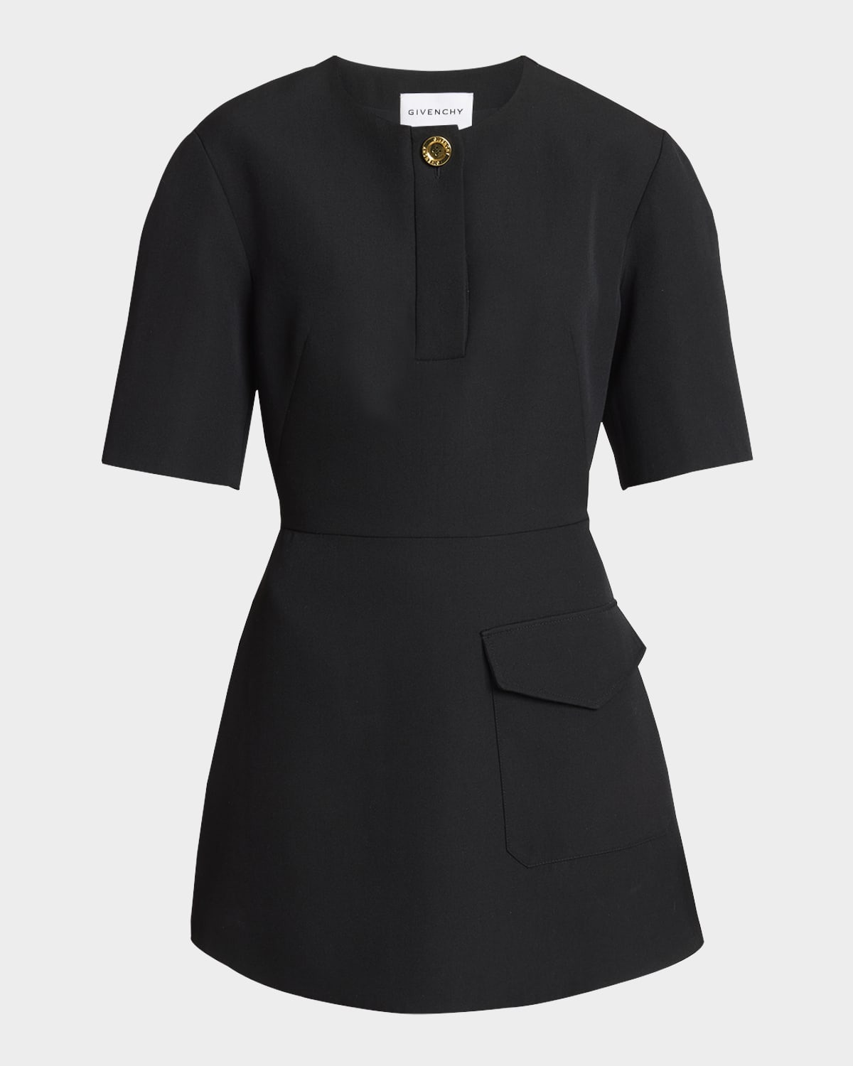- Givenchy cocoon dress with a logo engraved goldtone button detail and a front flap pocket - Round neckline; quarter button front - Elbow sleeves - Hip flap pocket - A-line silhouette - Mini length - Hidden closure - Wool - Made in Italy