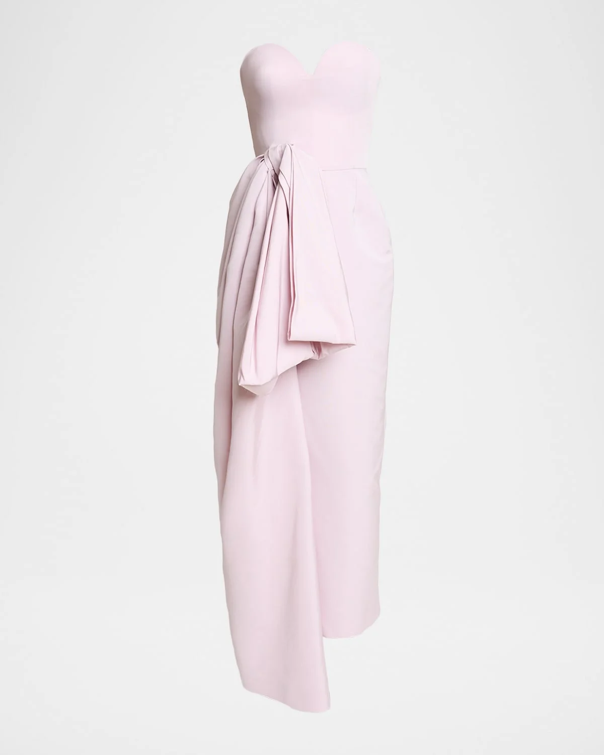 Givenchy bustier gown is crafted of polyfaille featuring a bullet bra and a large draped bow on the waist Sweetheart strapless neckline Sleeveless Column silhouette Highlow hem Invisible back zip Polyester Made in Italy