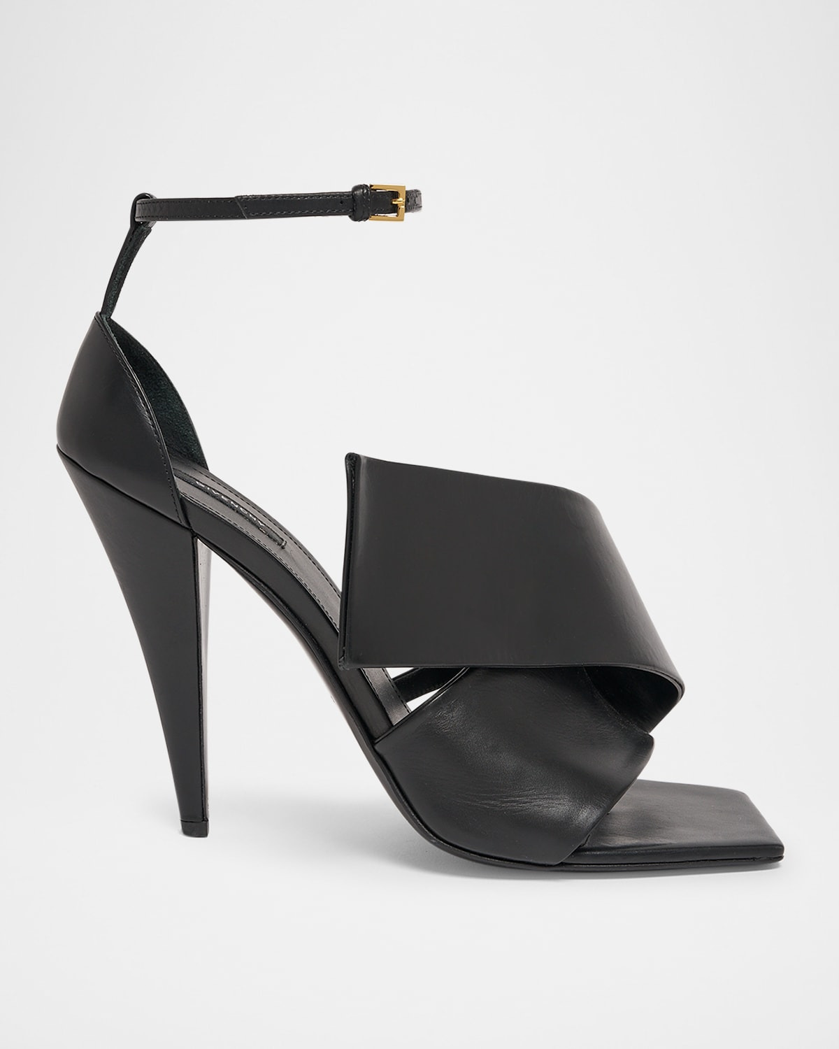- Givenchy sandals in smooth calf leather with a twisted ribbon design - 3.75 in / 95 mm stiletto heel - Square open toe - Buckle ankle strap - Leather lining - Made in Italy