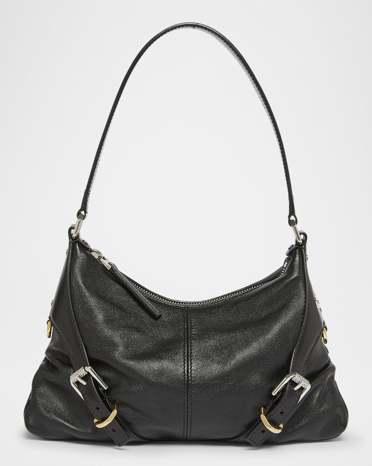 - Givenchy "Voyou" shoulder bag in shiny leather - Shoulder strap - Zip top closure - Exterior, harness hardware accent - Interior, one slip pocket - Approx. 6.5"H x 10.2"W x 3.5"D - Made in Italy