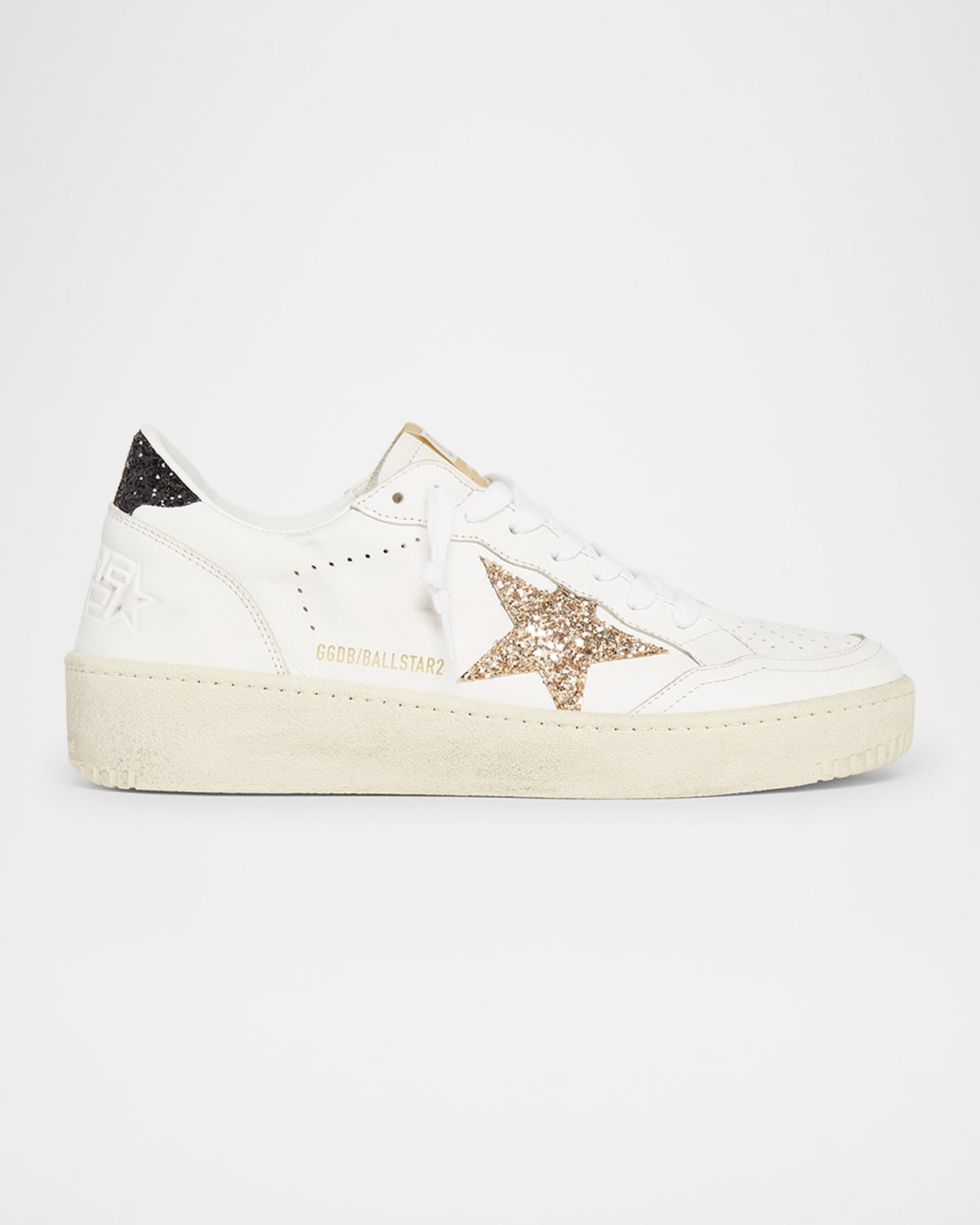 Women’s Ball Star in white leather with gold glitter star and black glitter heel tab