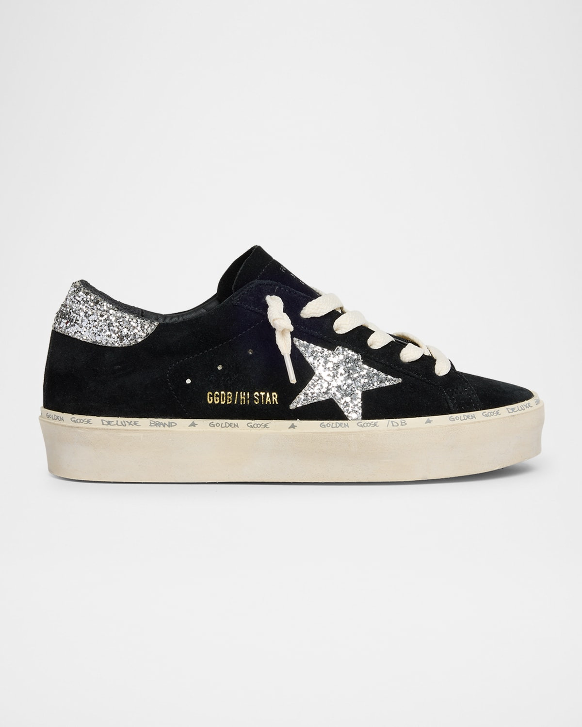 - Golden Goose low-top suede sneakers with glitter trim. - Signature contrast star at side. - Distressed flat heel. - Wraparound logo lettering at midsole. - Round toe. - Lace-up vamp. - Logo patch at tongue. - Breathable leather/cotton lining. - Signature stained rubber sole. - Made in Italy.