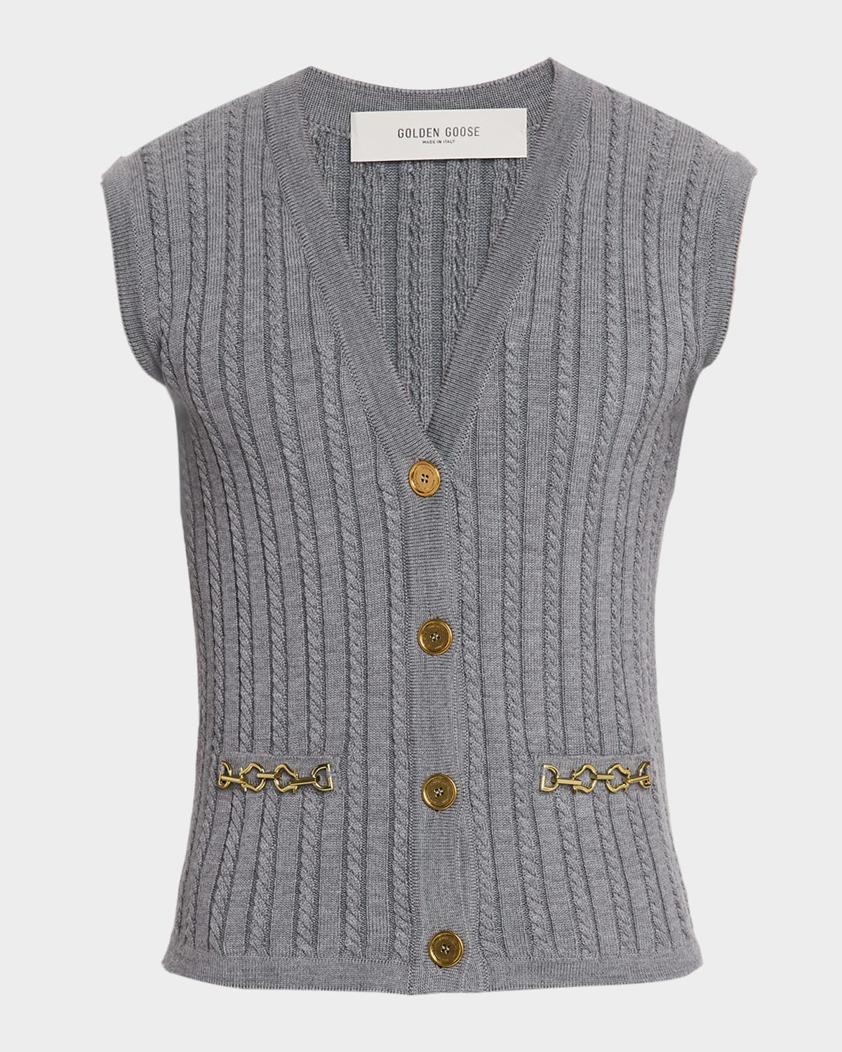 Knit from a lightweight woolblend, this sweater vest by Golden Goose features classic textured cable detailing and is finished with golden chain detailing Vneckline Sleeveless Slim fit Hip length Button front closure Virgin wool/nylon/polyamide Made in Italy