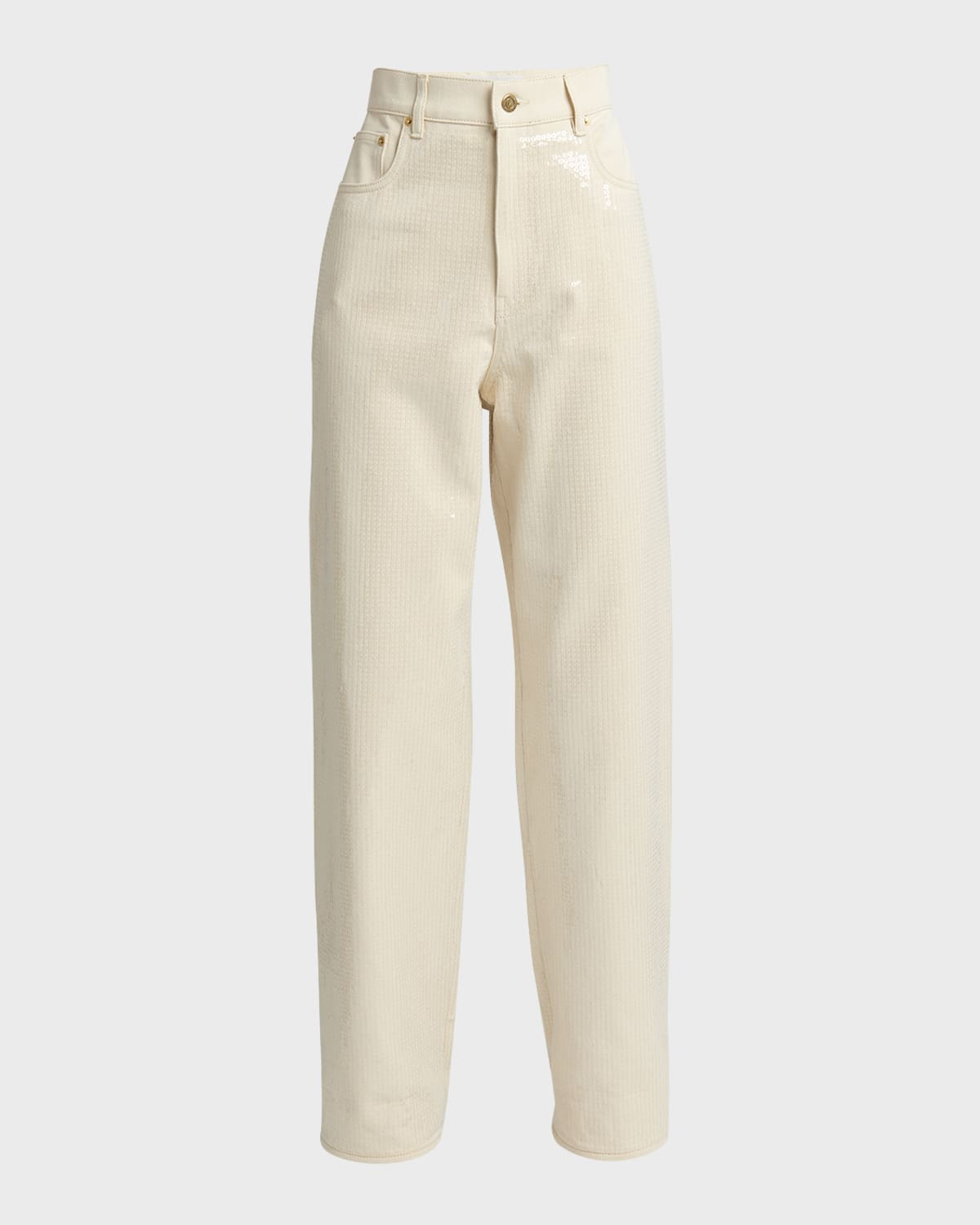 Golden Goose "Journey Kim" straightleg jeans featuring allover sequin embroidery in offwhite denim High rise Fivepocket style Relaxed fit Full length Button/zip fly; belt loops Cotton/polyester Dry clean, machine wash cold Made in Italy