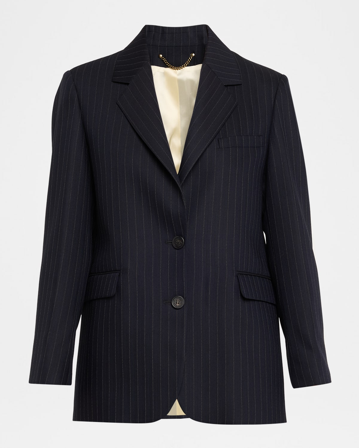 Golden Goose pinstripe woolblend jacket from the Journey Collar Notch lapels Singlebreasted front Long sleeves with button cuffs Hip flap pockets Oversized fit Vented back Buttonfront Virgin wool/viscose Dry clean Made in Italy