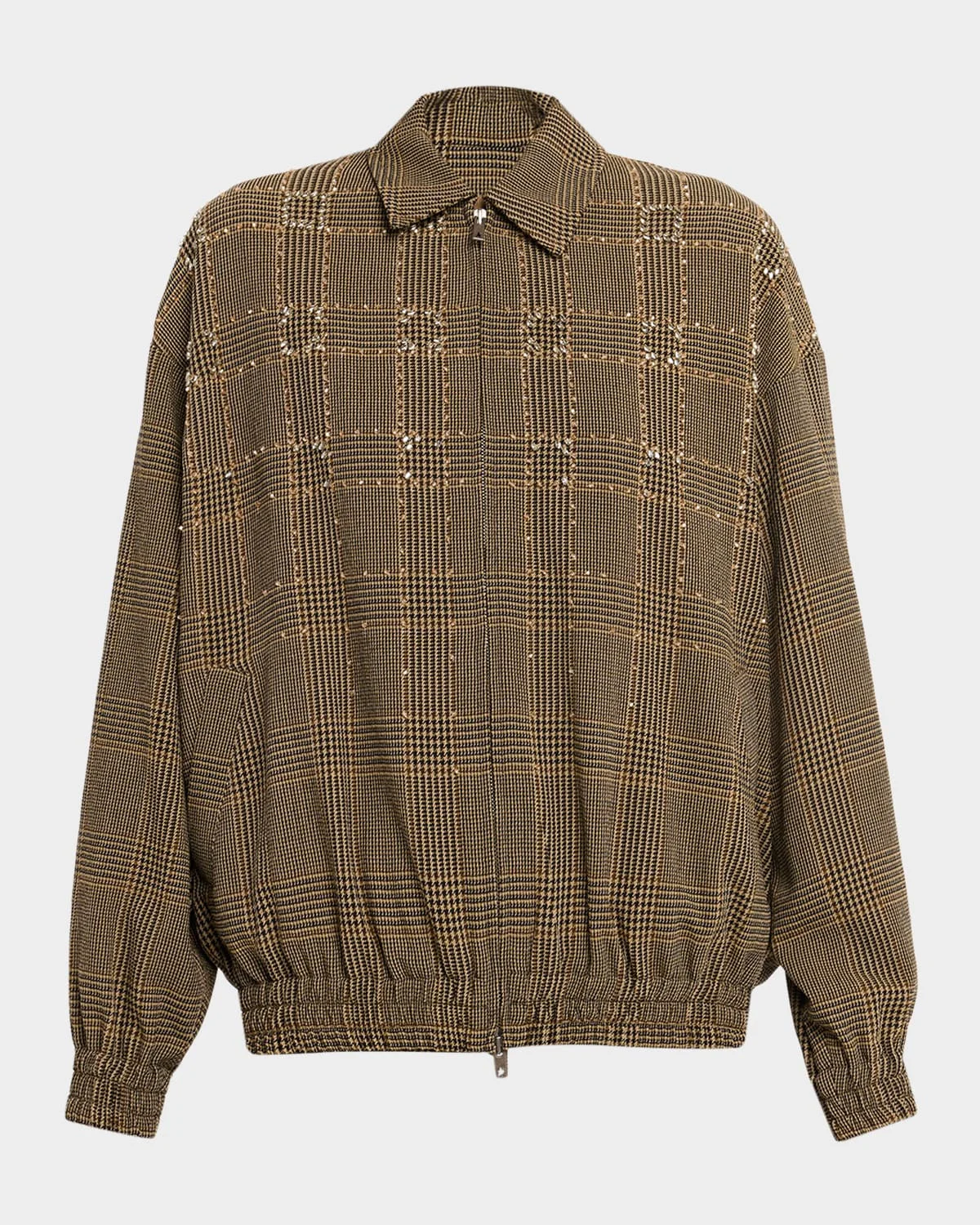 From the Golden Goose "Journey" collection, this bomberstyle jacket is crafted from Prince of Wales wool and embellished with shimmering crystals throughout. Spread collar Dropped shoulders Long sleeves with elastic cuffs Side pockets Relaxed fit Elasticized hem Zipfront Virgin wool/viscose Dry clean only Made in Italy