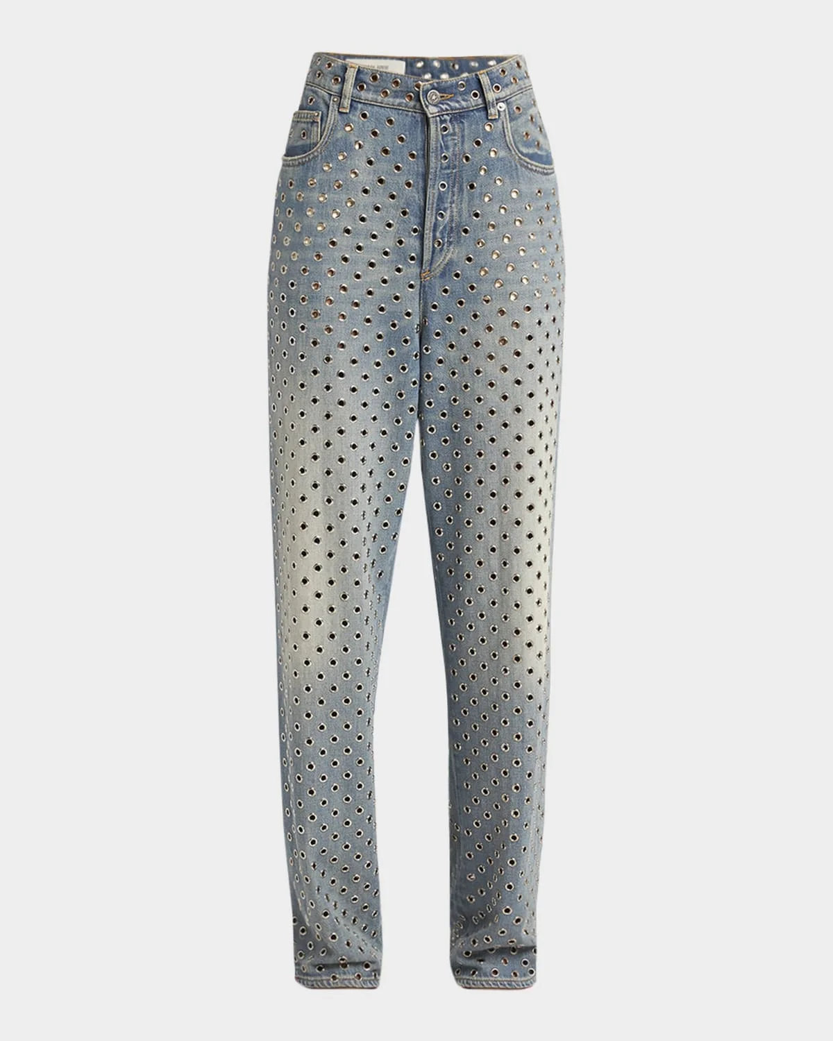 - Golden Goose "Kim" journey pants in sand washed denim embellished with allover grommet eyelets - Mid rise sits high on hip - Five-pocket style - Relaxed straight legs - Full length - Button/zip fly; belt loops - Cotton/polyester - Machine wash cold - Made in Italy