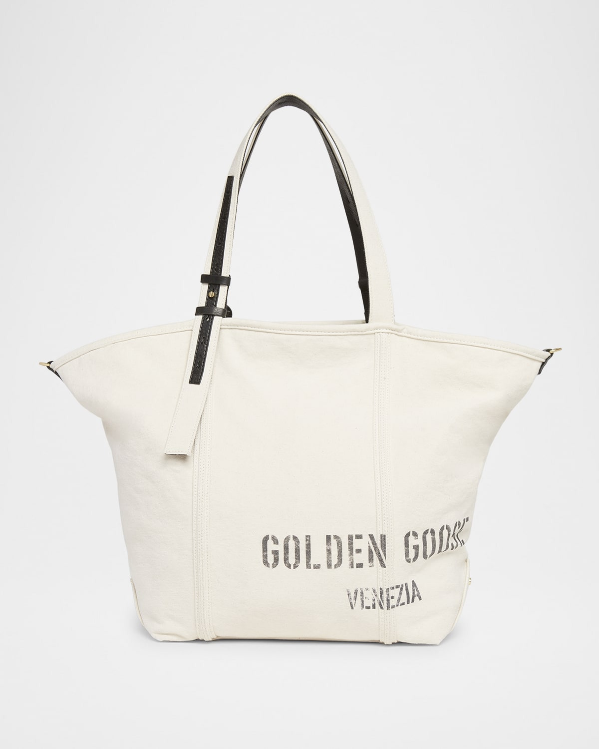 - Golden Goose canvas fabric and leather tote bag with logo accent - Adjustable shoulder straps - Detachable woven leather shoulder strap - Open top with lobster clasp closure - Interior, leashed zip pouch bag - Approx. 11.8"H x 16.5"W x 6"D - Made in Italy