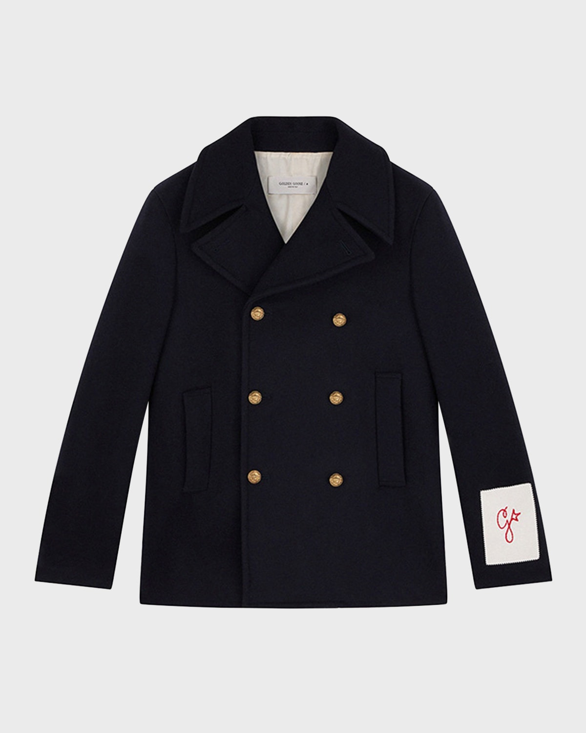 - Golden Goose solid peacoat with branded golden buttons - Notched lapels; double-breasted front - Welt pockets - Long sleeves - Single back vent - Virgin wool/polyamide/viscose - Made in Italy - Model is 6'1"/185cm.