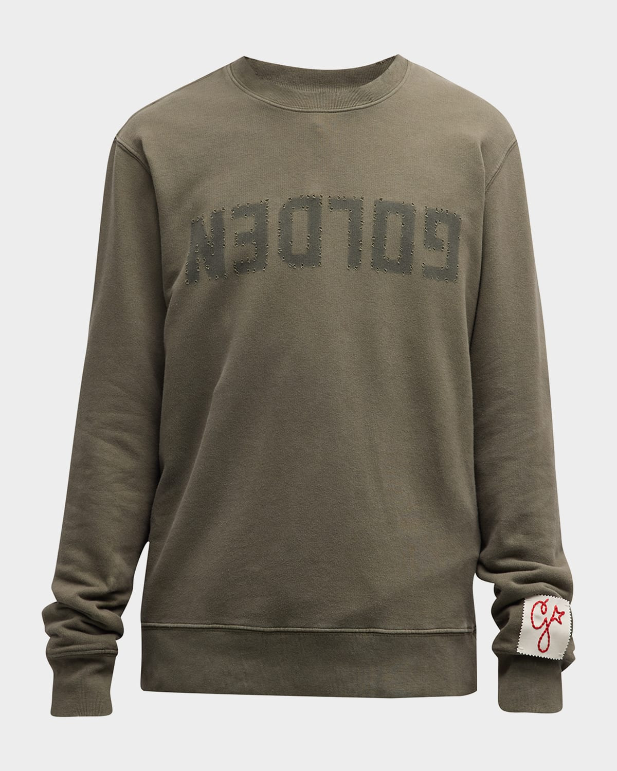 - Golden Goose "Golden" sweatshirt with distressed trim - Features reverse logo across chest - Crew neckline - Banded cuffs and hem - Logo patch at left cuff - Pullover style - Classic fit - Cotton - Made in Italy - Model is 6'1"/185cm.