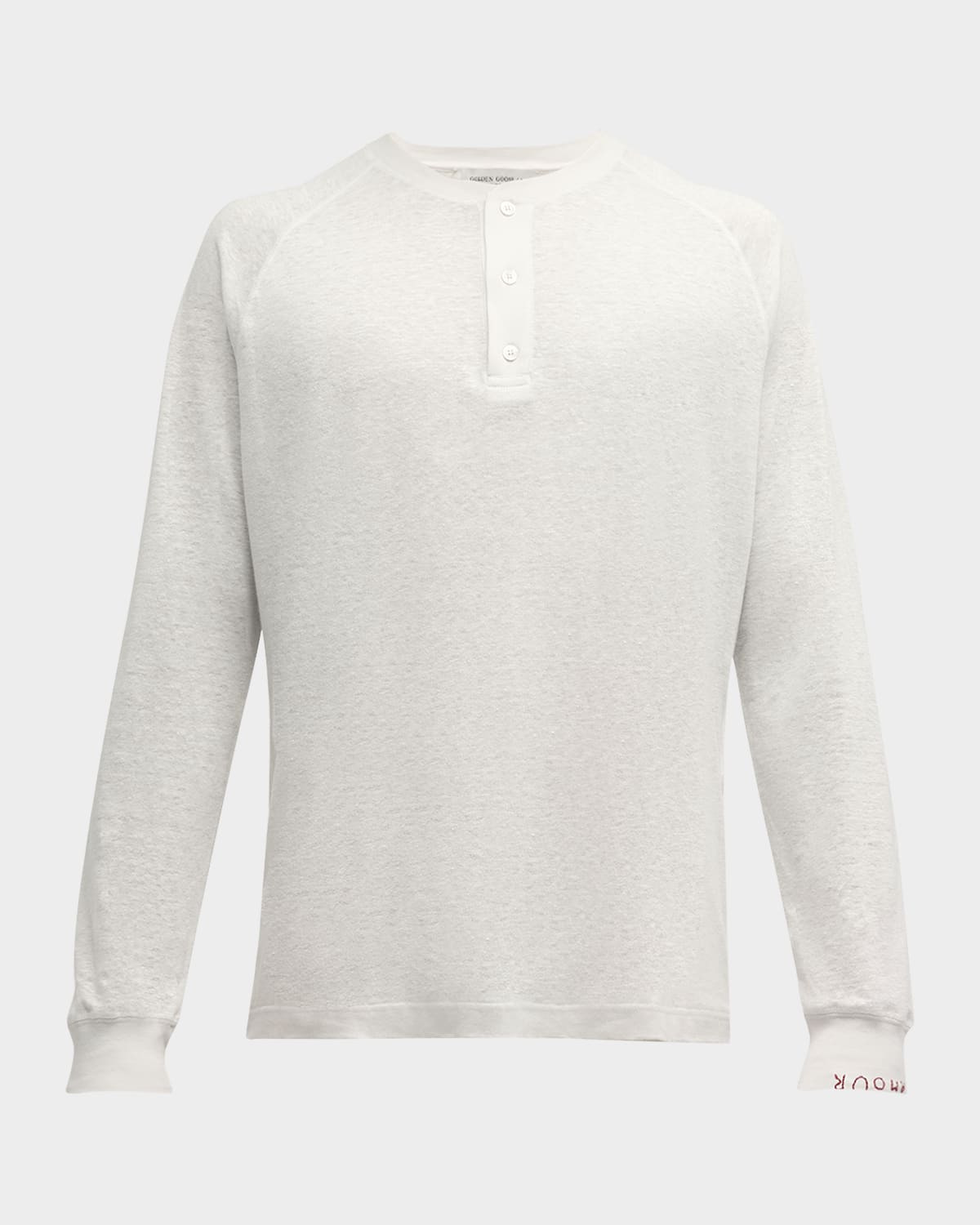 - Golden Goose "Journey" T-shirt in solid linen - Henley neckline - Long raglan sleeves - "Amour" embroidery at left cuff - Pullover style - Made in Italy - Model is 6'1"/185cm.