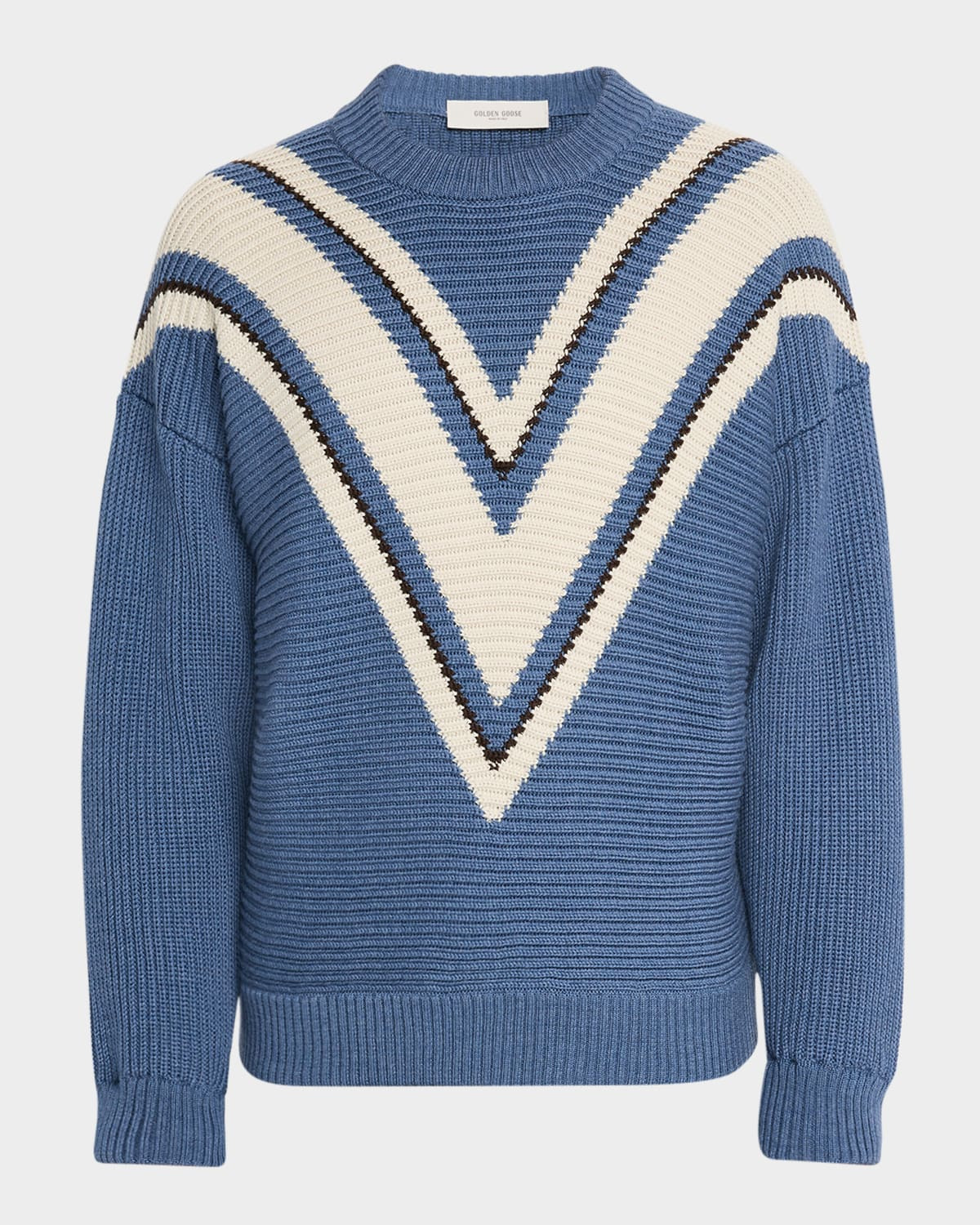 - Golden Goose sweater in premium rib-knit virgin wool jacquard, displaying a contrasting V-motif - Journey collection - Crew neckline - Long sleeves - Ribbed cuffs and hem - Drop shoulder - Pullover style - Relaxed fit - Virgin wool - Unlined - Made in Italy