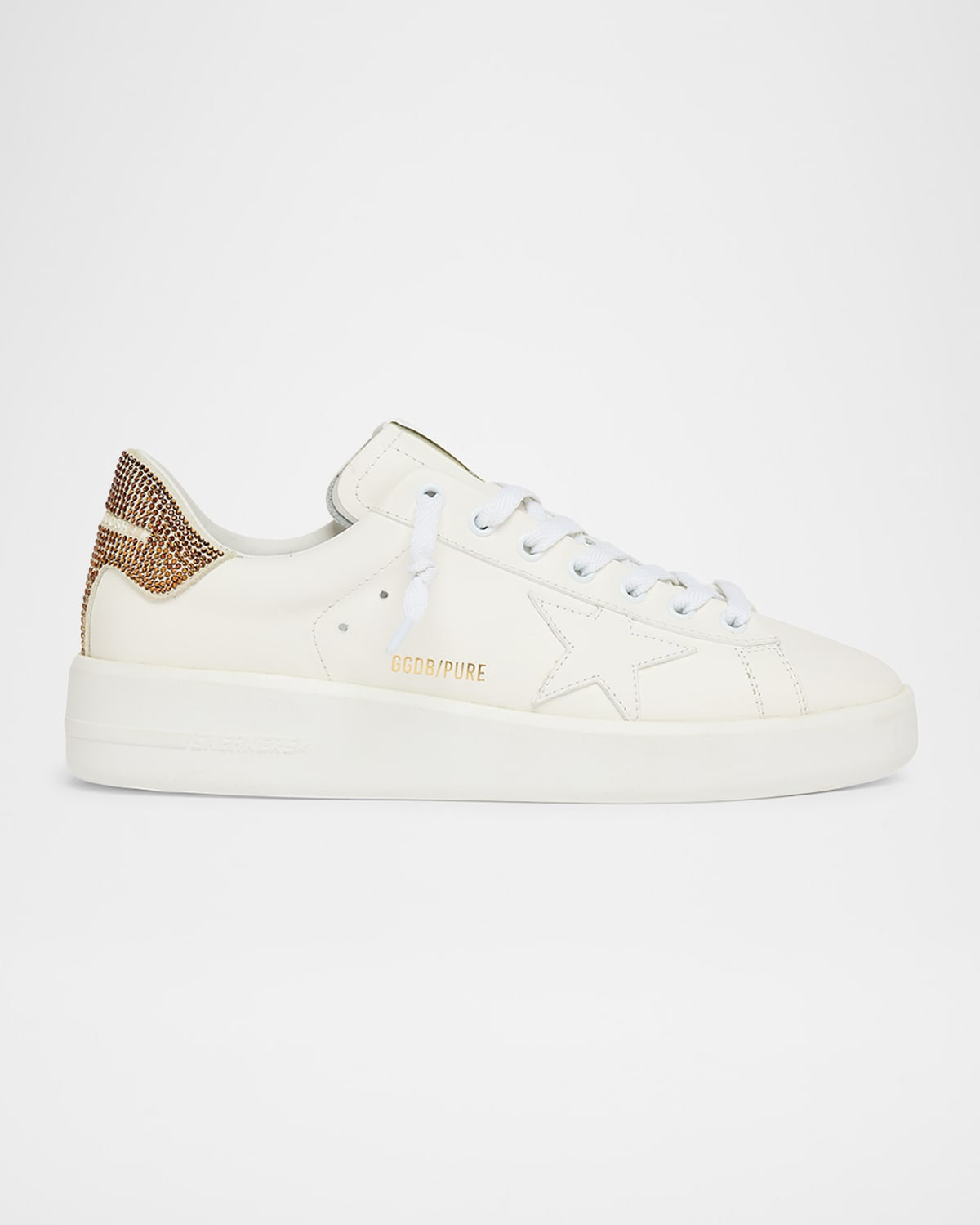 - Golden Goose "Pure Star" low-top leather sneakers - Flat heel - Round toe - Lace-up vamp - Rhinestone-embellished heel tab - Rubber outsole - Made in Italy