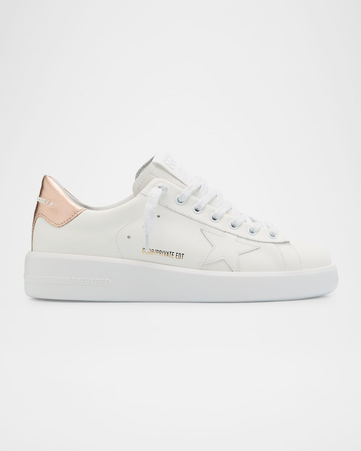 - This cleaned-up version of Golden Goose's cult distressed sneaker is handmade from smooth leather with a metallic heel tab for extra pizzazz. The word 'sneakers' adds a quirky touch to the chunky sole, which was developed after extensive research and designed to be lightweight, bouncy and shock-absorbing. - Golden Goose smooth leather sneakers with metallic leather trim and signature star at side. - Flat heel. - Round toe. - Lace-up vamp. - Breathable leather/cotton lining. - Rubber sole. - Made in Italy.