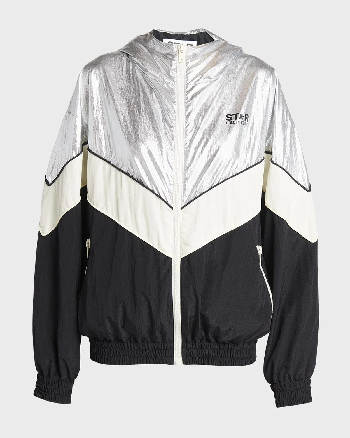 - Golden Goose "Star" windbreaker featuring contrasting patchwork in a metallic technical fabric - Hooded neckline - Dropped shoulders - Long sleeves; elasticated cuffs - Side zip pockets - Relaxed fit - Elasticated hem - Zip-front - Nylon/polyamide - Lining: Polyester - Do not iron - Made in Italy - Model is 5'10"/177cm.